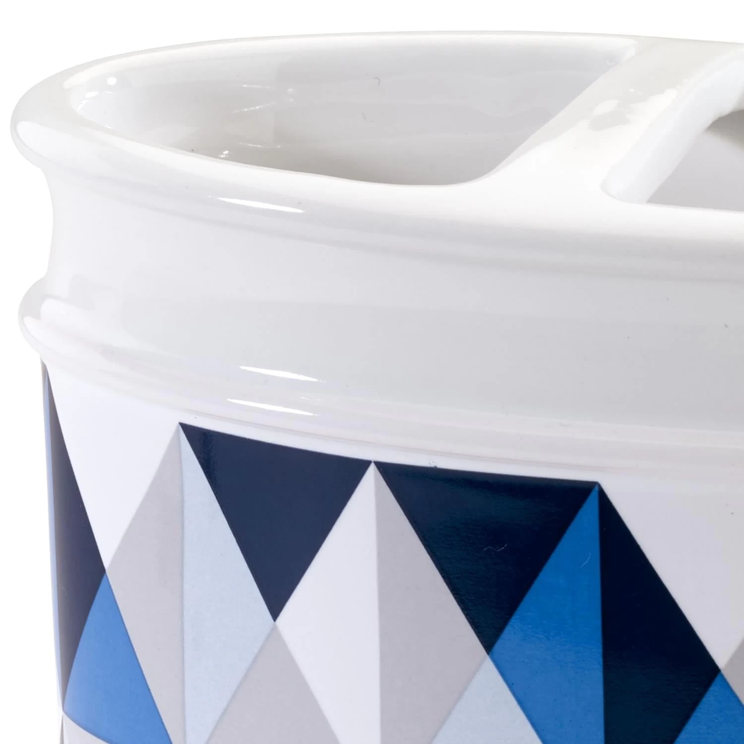 The Now House by Jonathan Adler Bleecker Toothbrush Holder is decorated with a triangle design decal in shades of blue, grey and white on a white ceramic body. Imported.