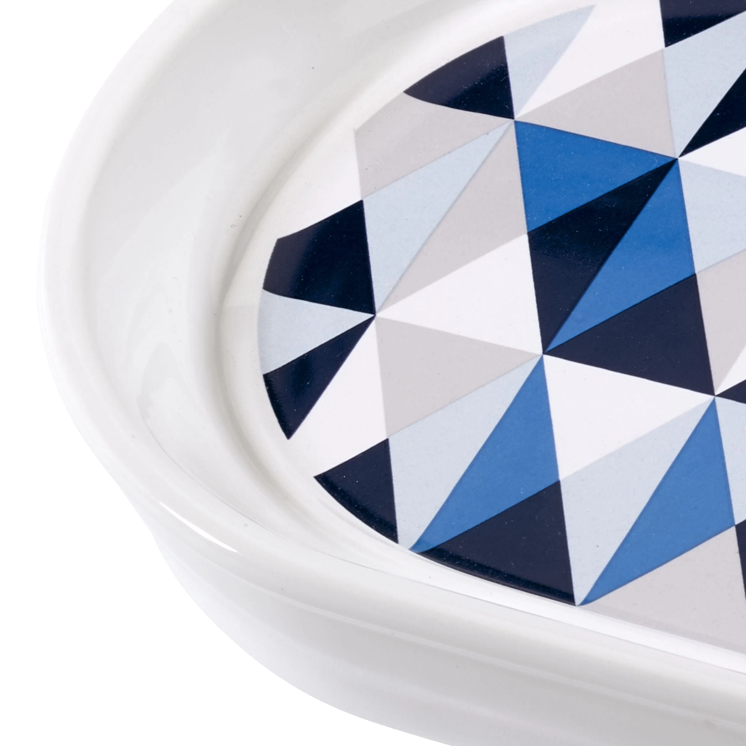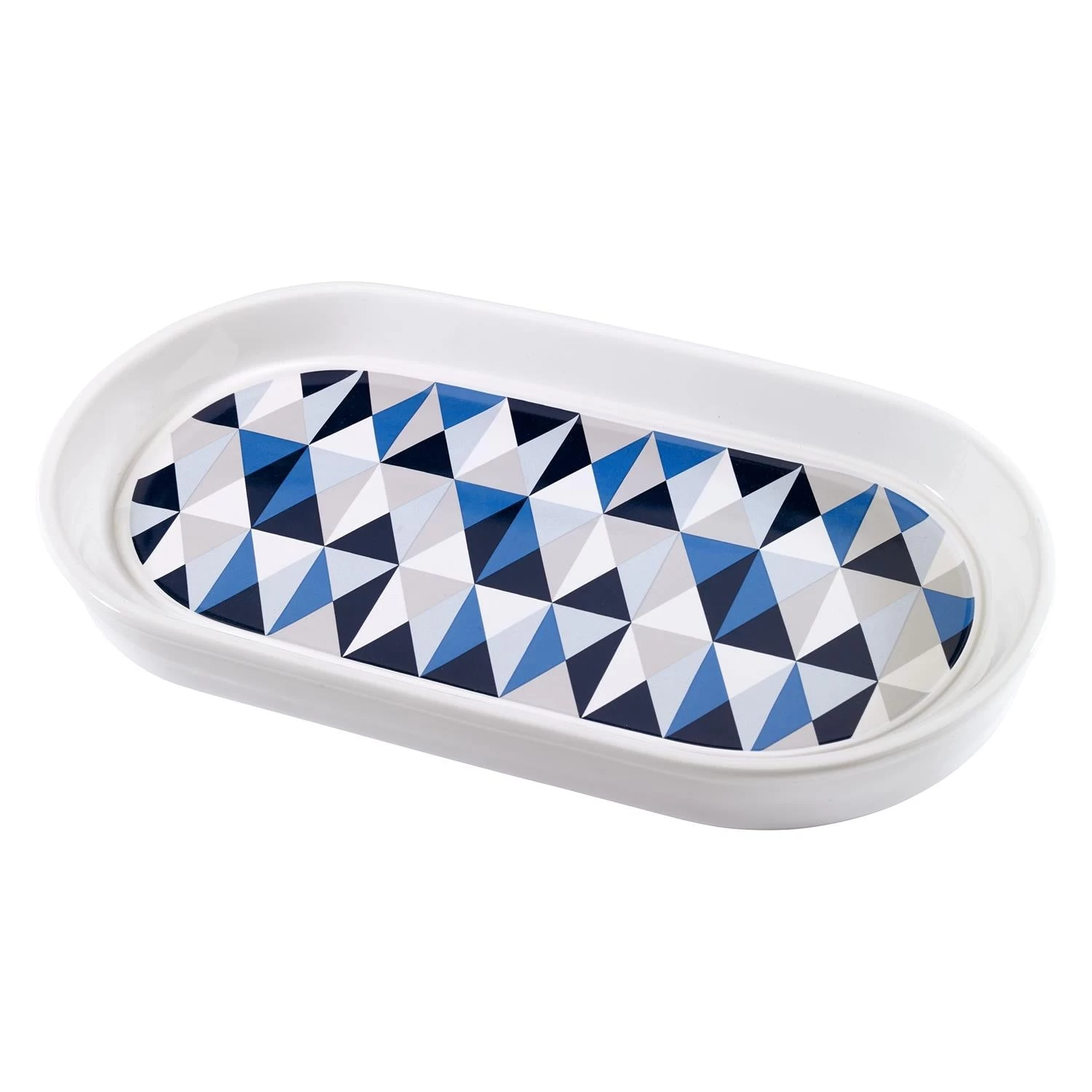 The Now House by Jonathan Adler Bleecker Tumbler is decorated with a triangle design decal in shades of blue, grey and white on a white ceramic body. Imported.