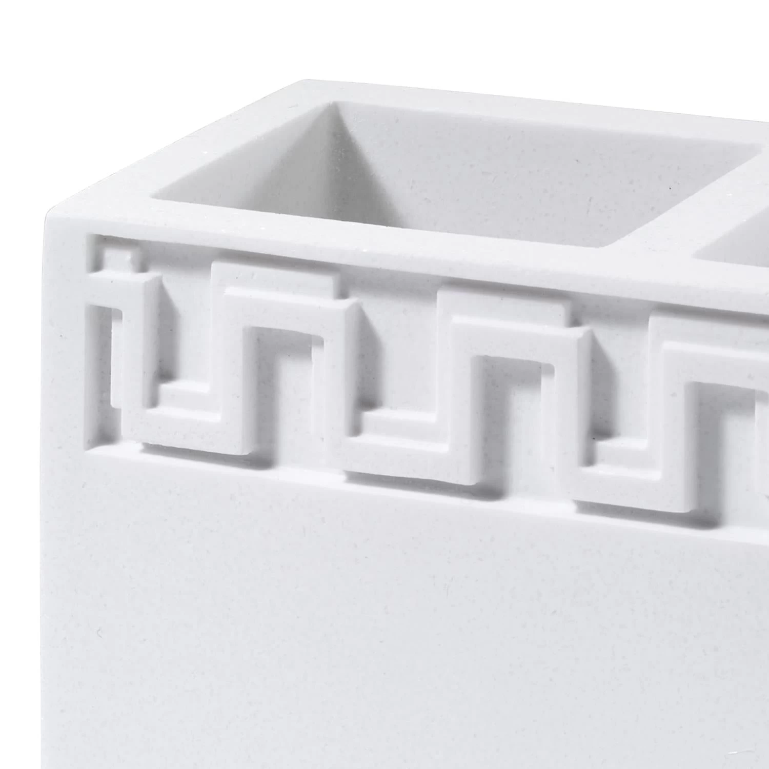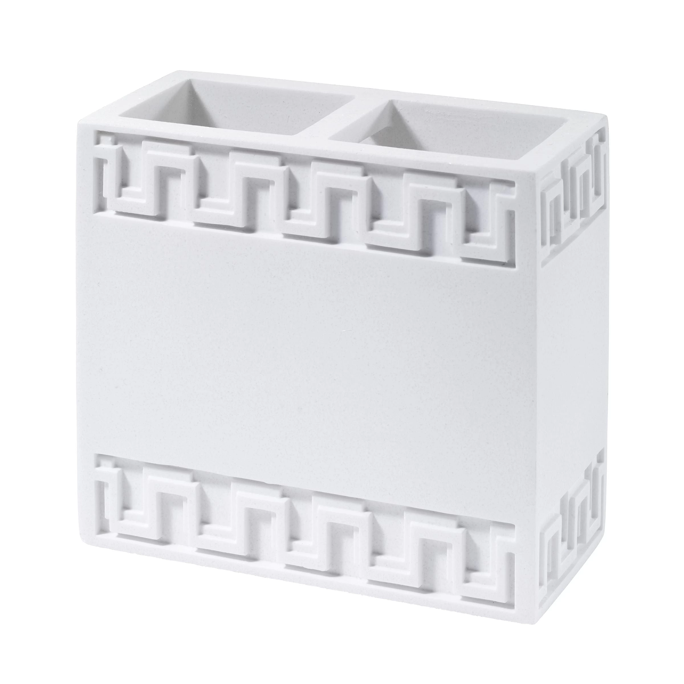 The Now House by Jonathan Adler Gramercy Toothbrush Holder features a classic Greek key embossed at the top and bottom on a white body. Made of durable resin. Imported.