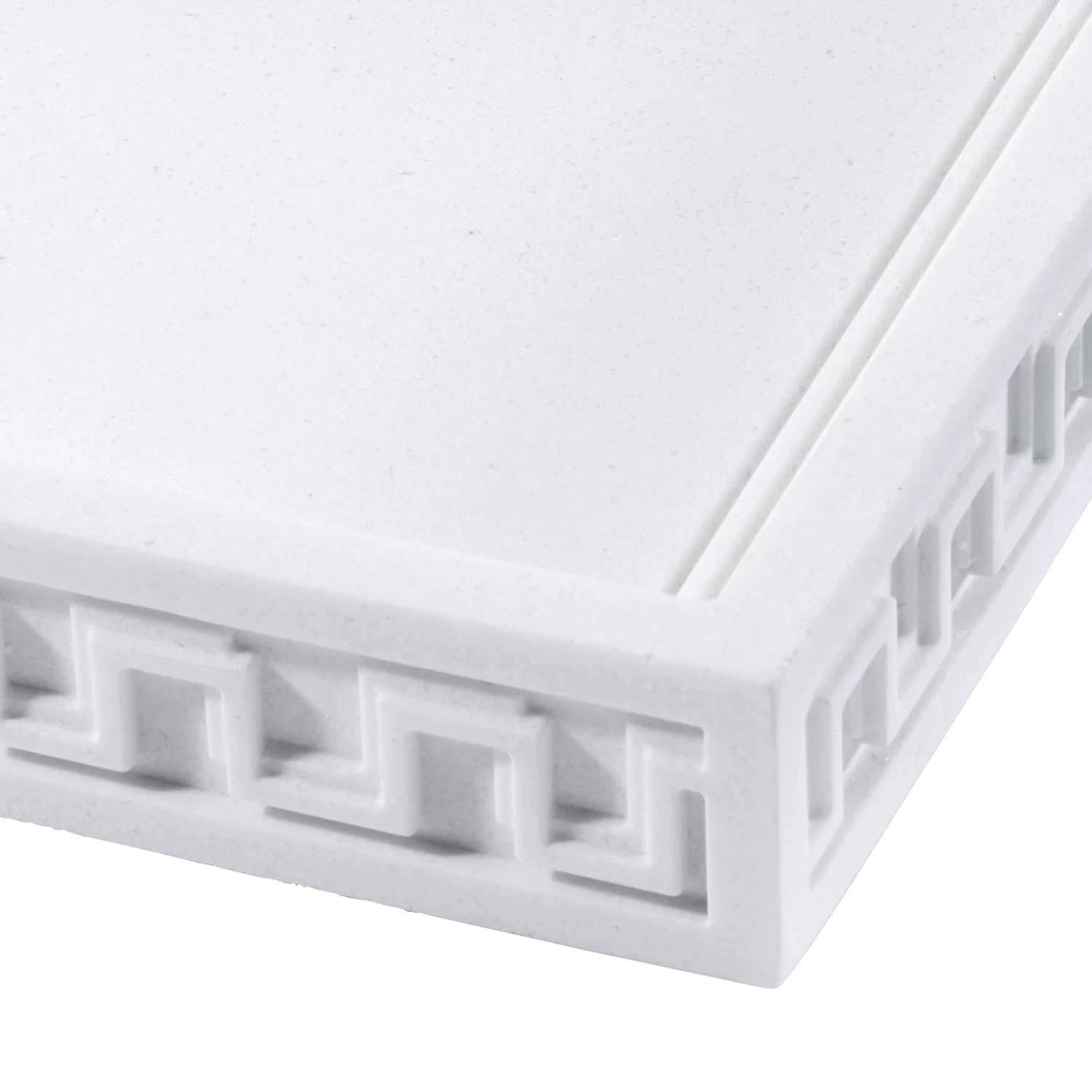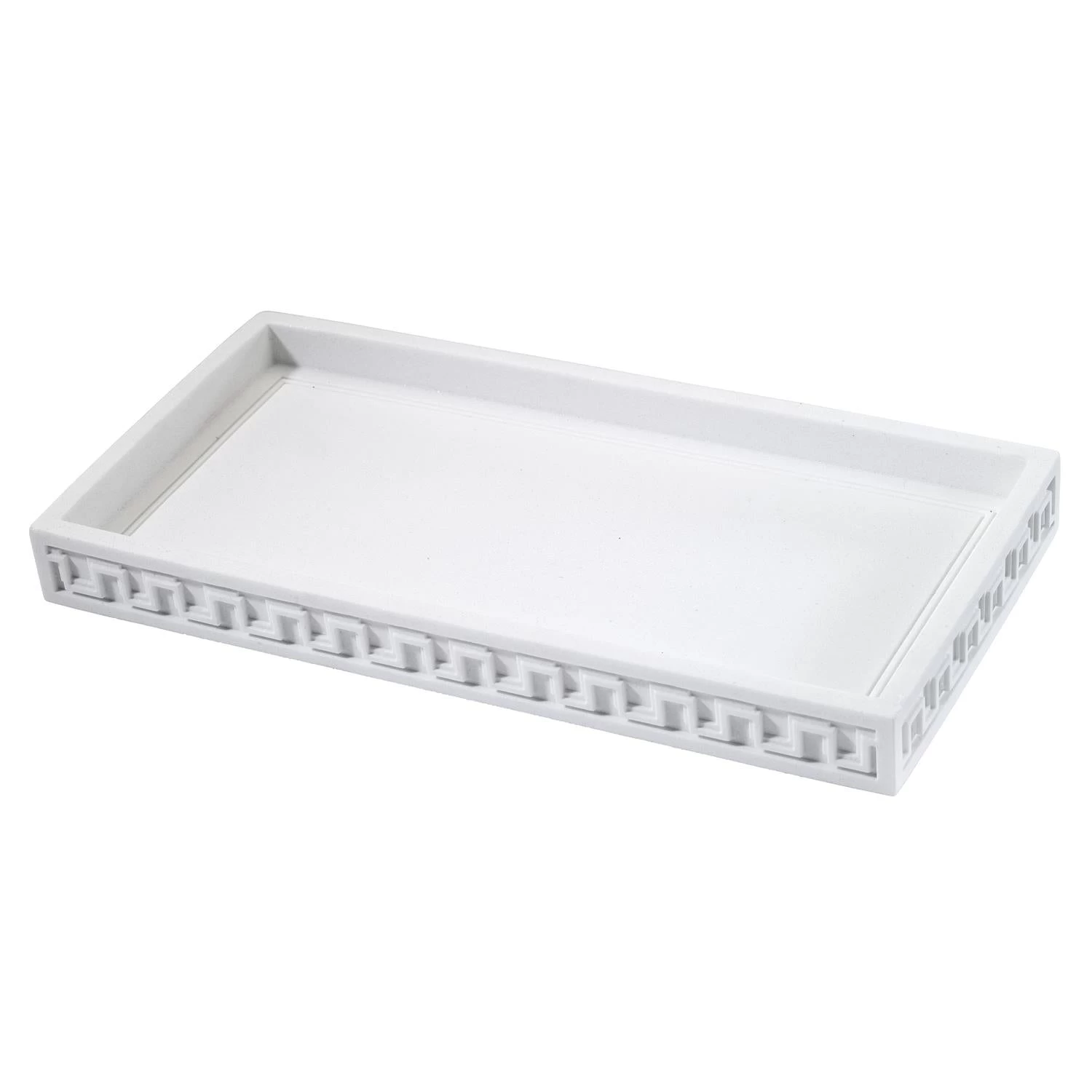The Now House by Jonathan Adler Gramercy Tray features a classic Greek key embossed around the outside on a white body. Made of durable resin, 5″ x 10″. Imported.