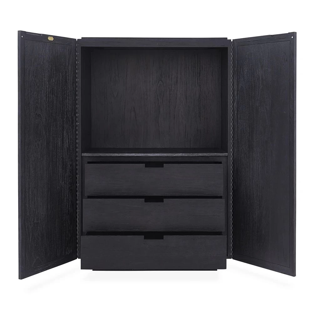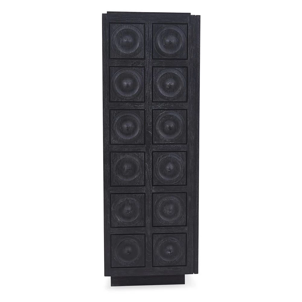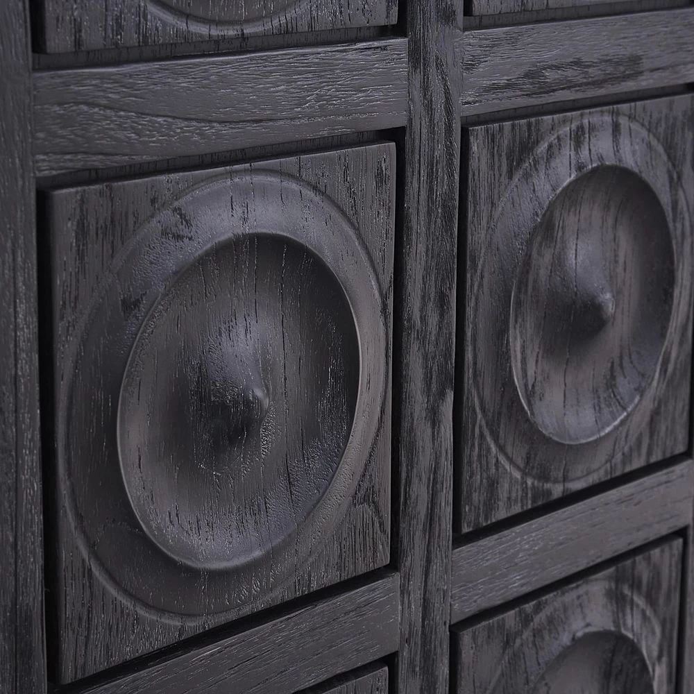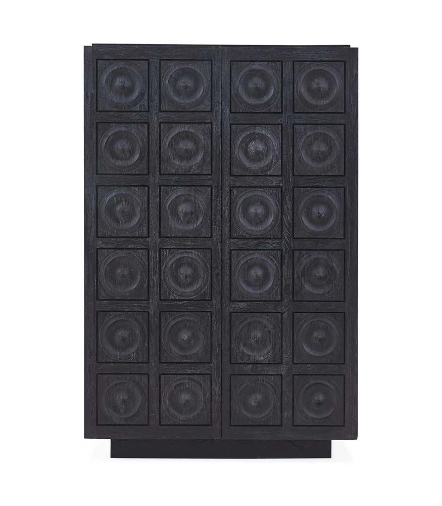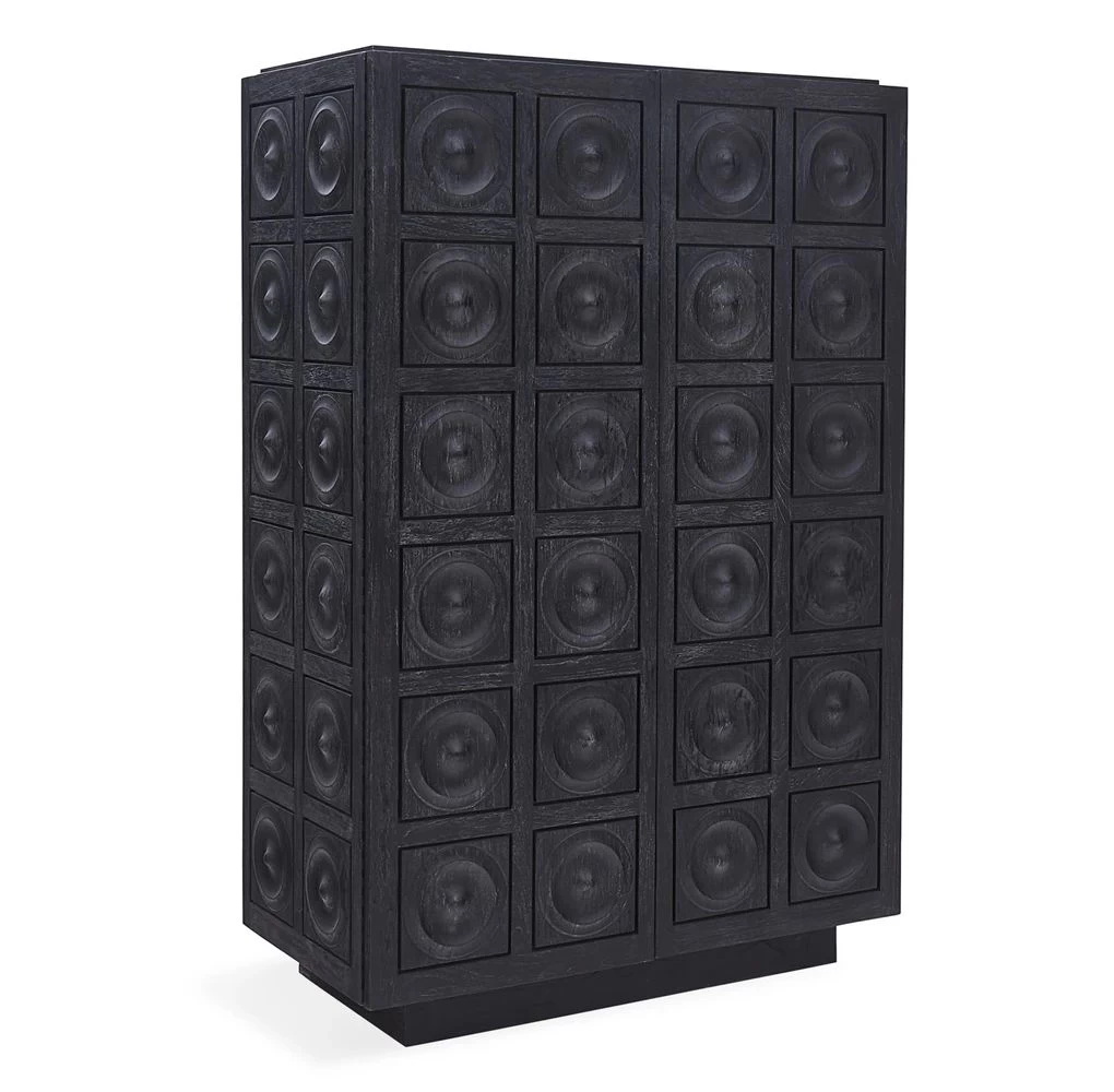 Limed Luxury. An ebonized and limed mindi wood cabinet faced with solid mindi circle tiles. Featuring hidden pulls and an interior fitted with three self-closing drawers and an adjustable shelf.