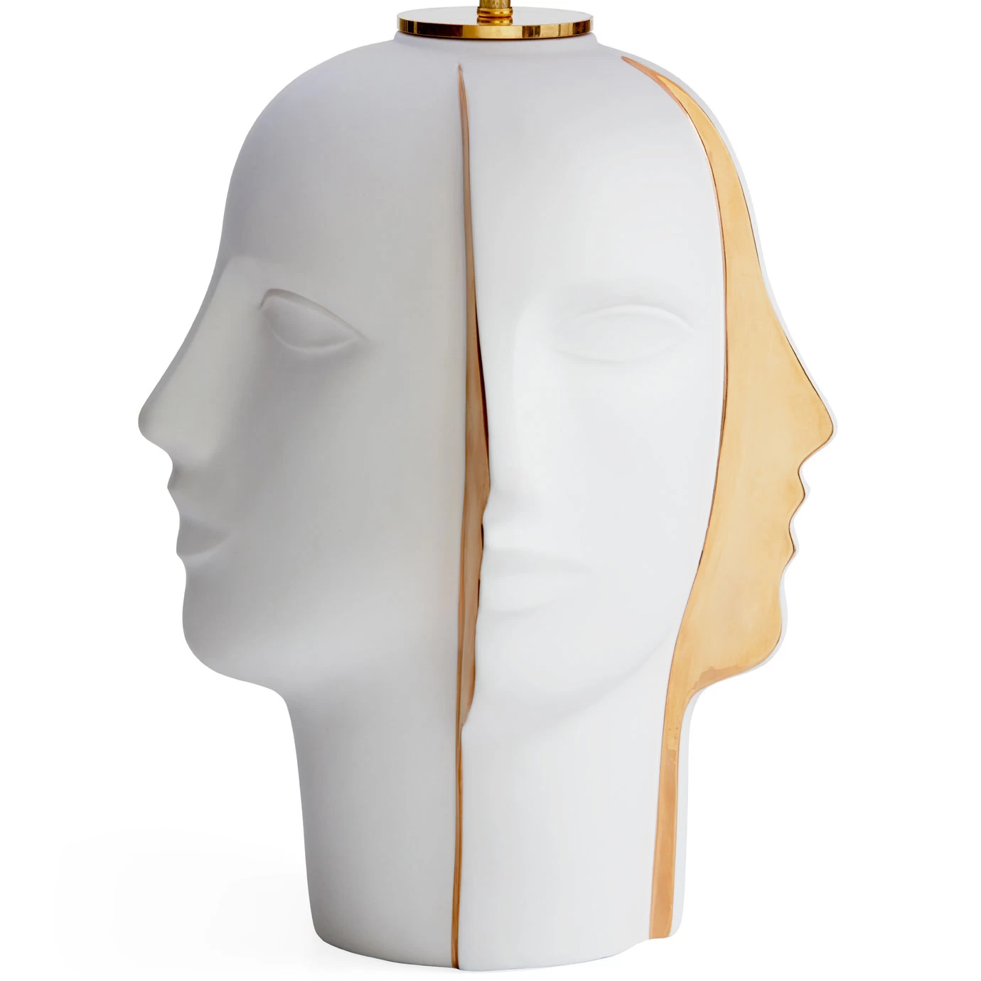 The head-turning Atlas Table Lamp features four half-faces crafted from matte white porcelain with a Gold-glazed silhouette when viewed from the opposite angle. A white paper shade and brass accents complement the sculptural base for a luxurious look that will draw attention wherever it is placed. Dimmer switch included.