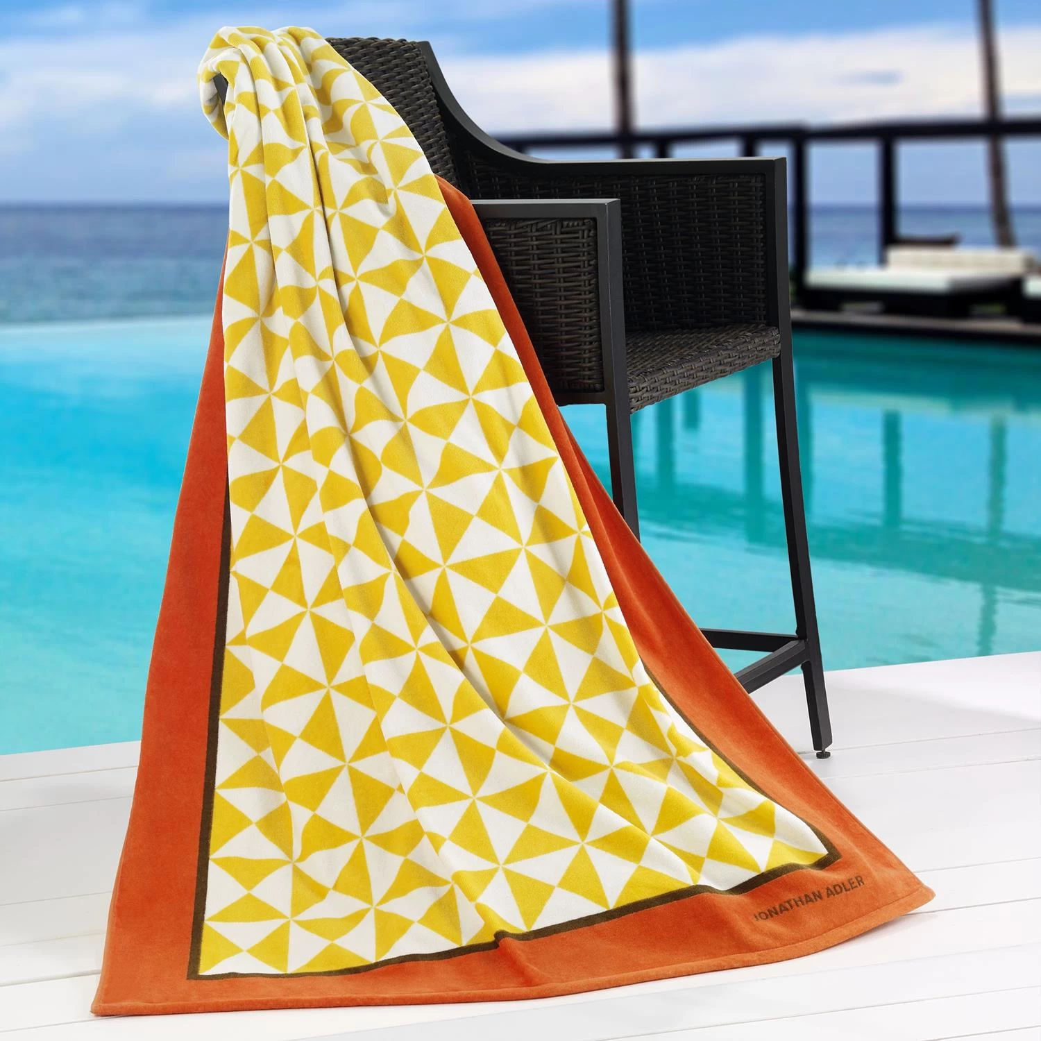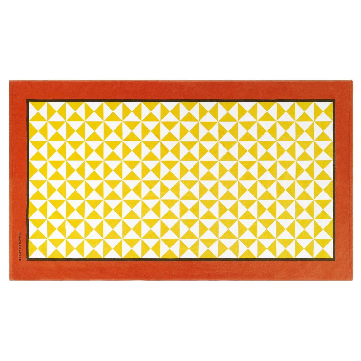 The Jonathan Adler Collection Bow Ties Beach Towel features waves of sunny yellow bow ties on a white ground with a deep orange border. The front is sheared and the back is a sunny yellow yarn-dyed terry. The towel measures an oversized 40 in. x 70 in. and weighs over 2 pounds.