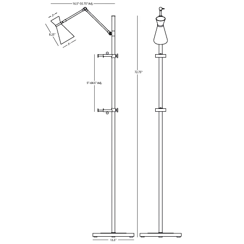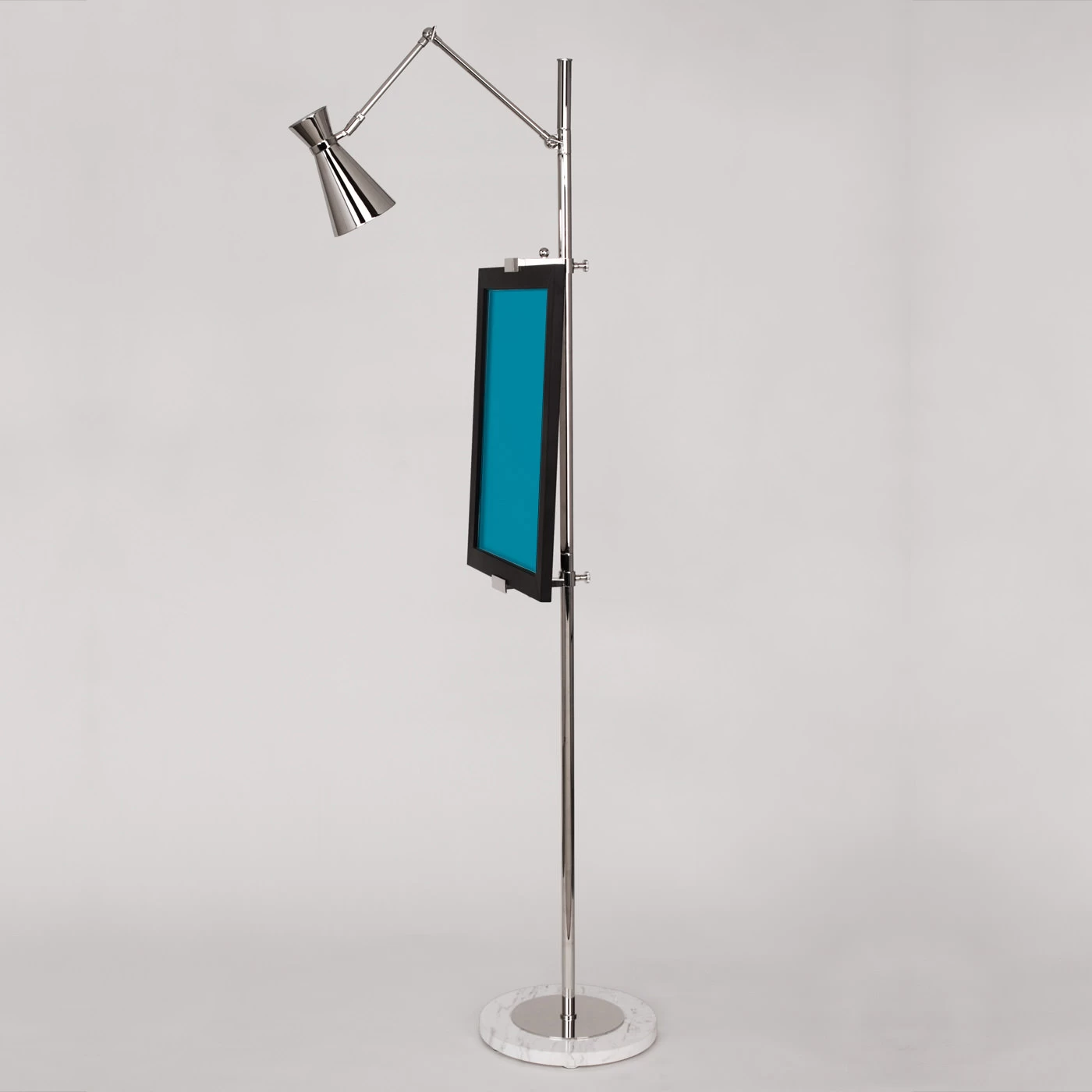 The Bristol Adjustable Floor Easel is a perfect way to display art. Who says paintings have to be on the wall? Available in a Polished Nickel finish with a Carrera Marble base or an Antique Brass finish with a Honed Travertine base with an easel that adjusts from 5 to 64.5 inches in height. Maximum holding weight is 20 pounds.