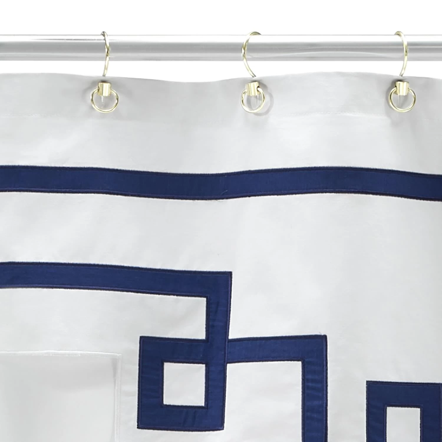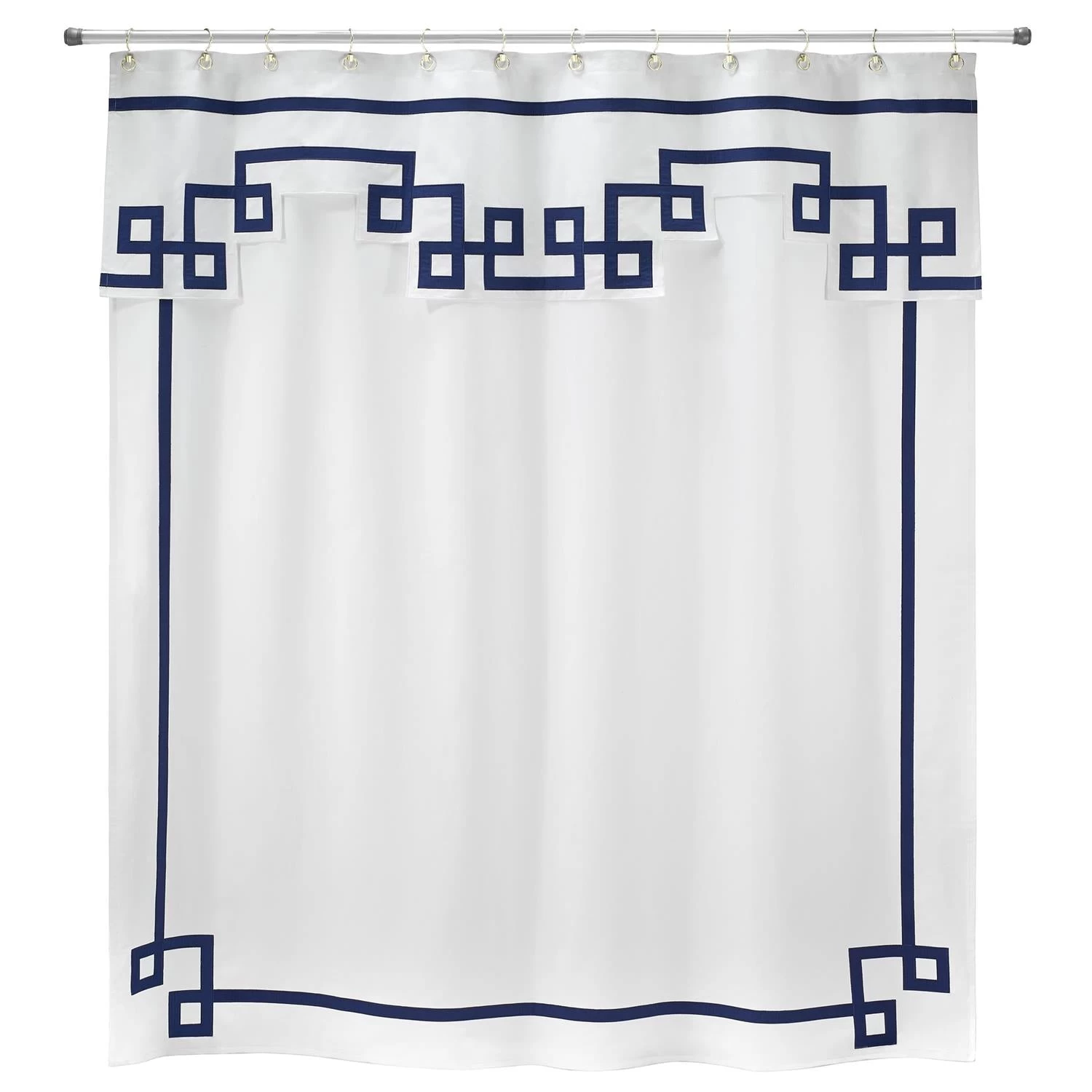 The Jonathan Adler Collection Campaign Shower Curtain is decorated with a navy embroidered and appliqued border design on a white 100% cotton duck cloth. The attached engineered valance is also appliqued and embroidered on a 100% cotton 200 thread count percale cloth. 72″ x 72″.