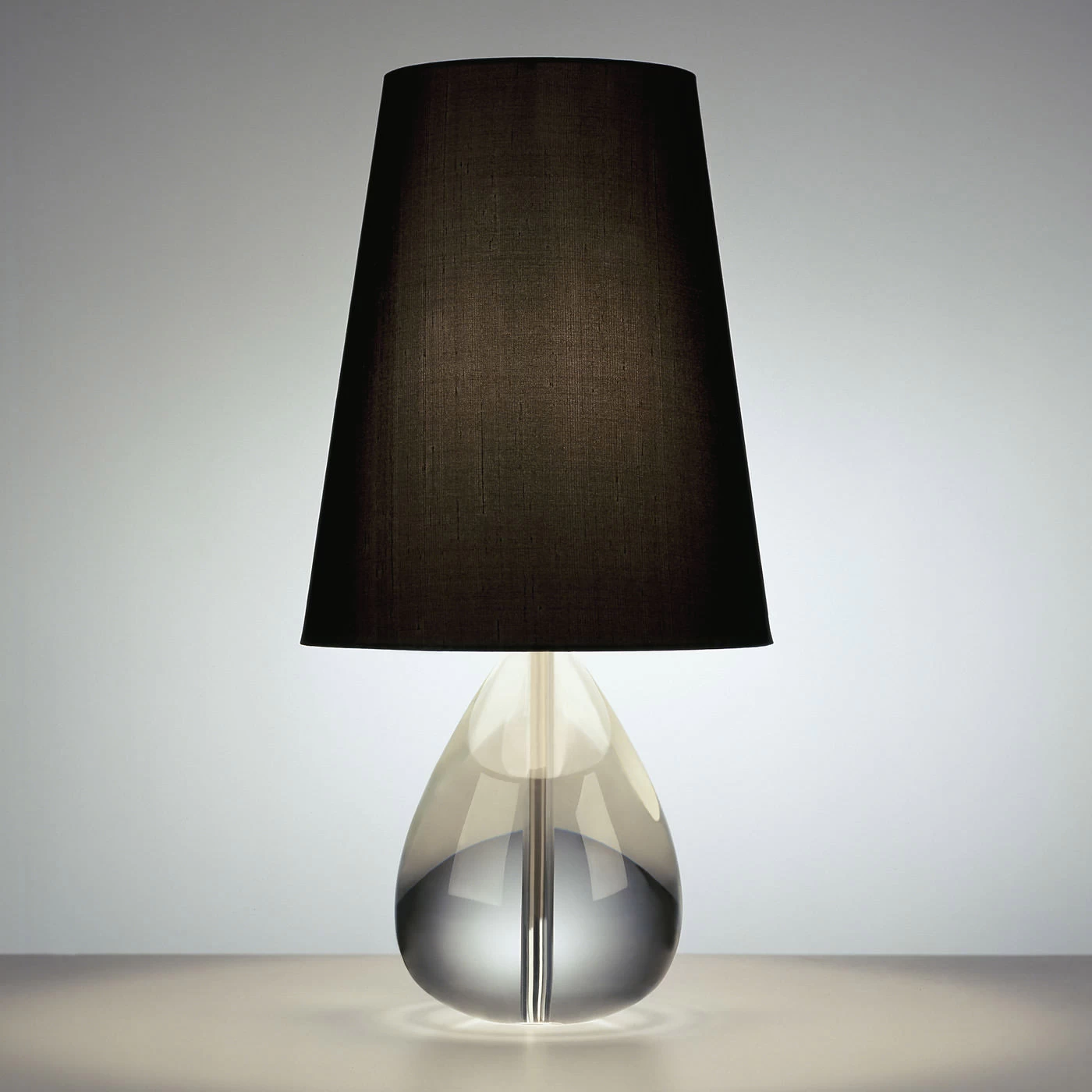 Claridge Teardrop Table Lamp features a Crystal body with polished nickel accents. Shade available in oyster gray silk dupioni or black silk dupioni with a rolled edge hem. Includes full range dimmer switch. One 100 watt, 120 volt A19 type medium base bulb is required, but not included. Shade: 9.75 width x 12 height. Overall: 9.75 inch width x 20 inch height. UL listed.