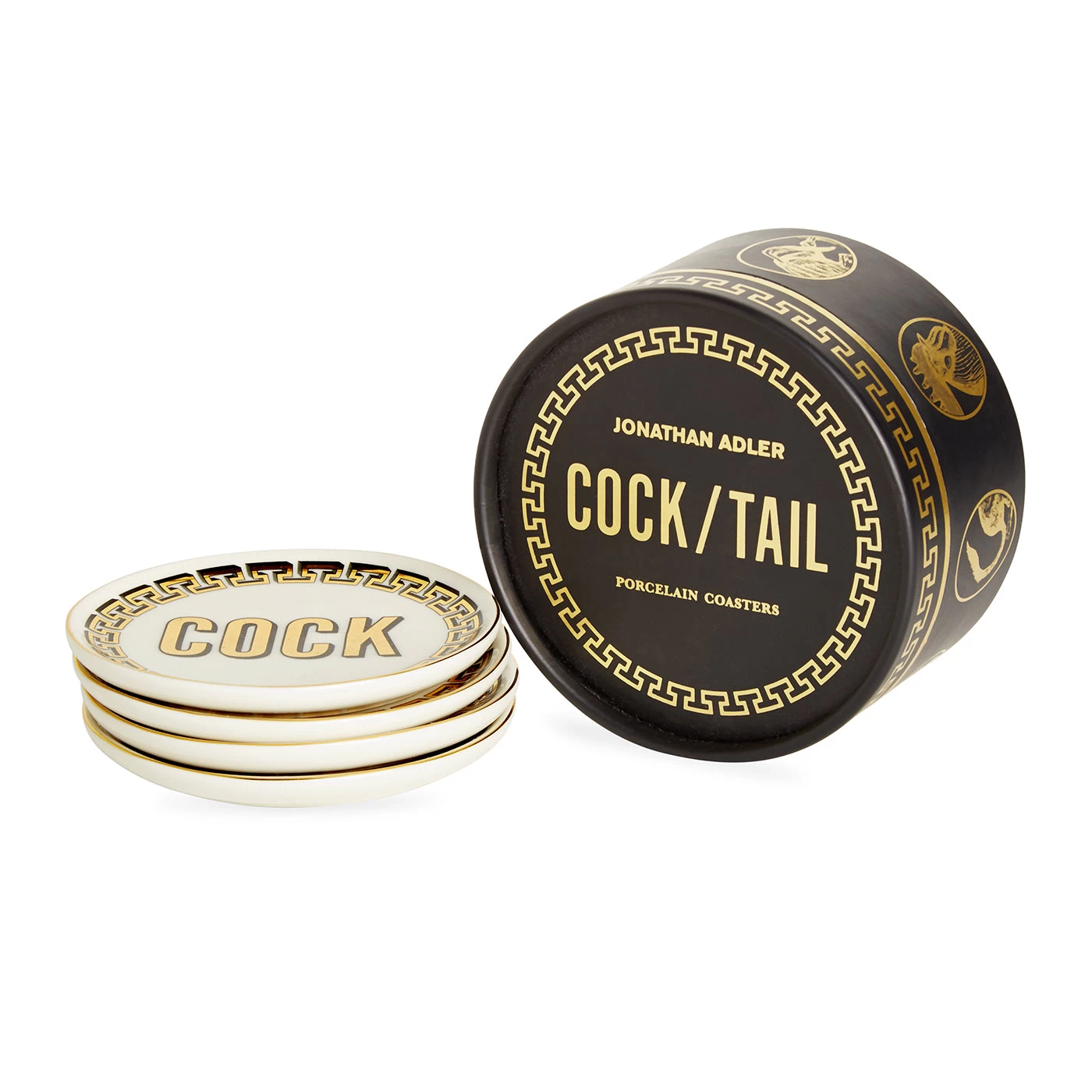 Focus on what really matters (a stiff drink) with our Cock-Tail Coasters. A bold announcement crafted from high-fired porcelain and adorned with real gold accents.