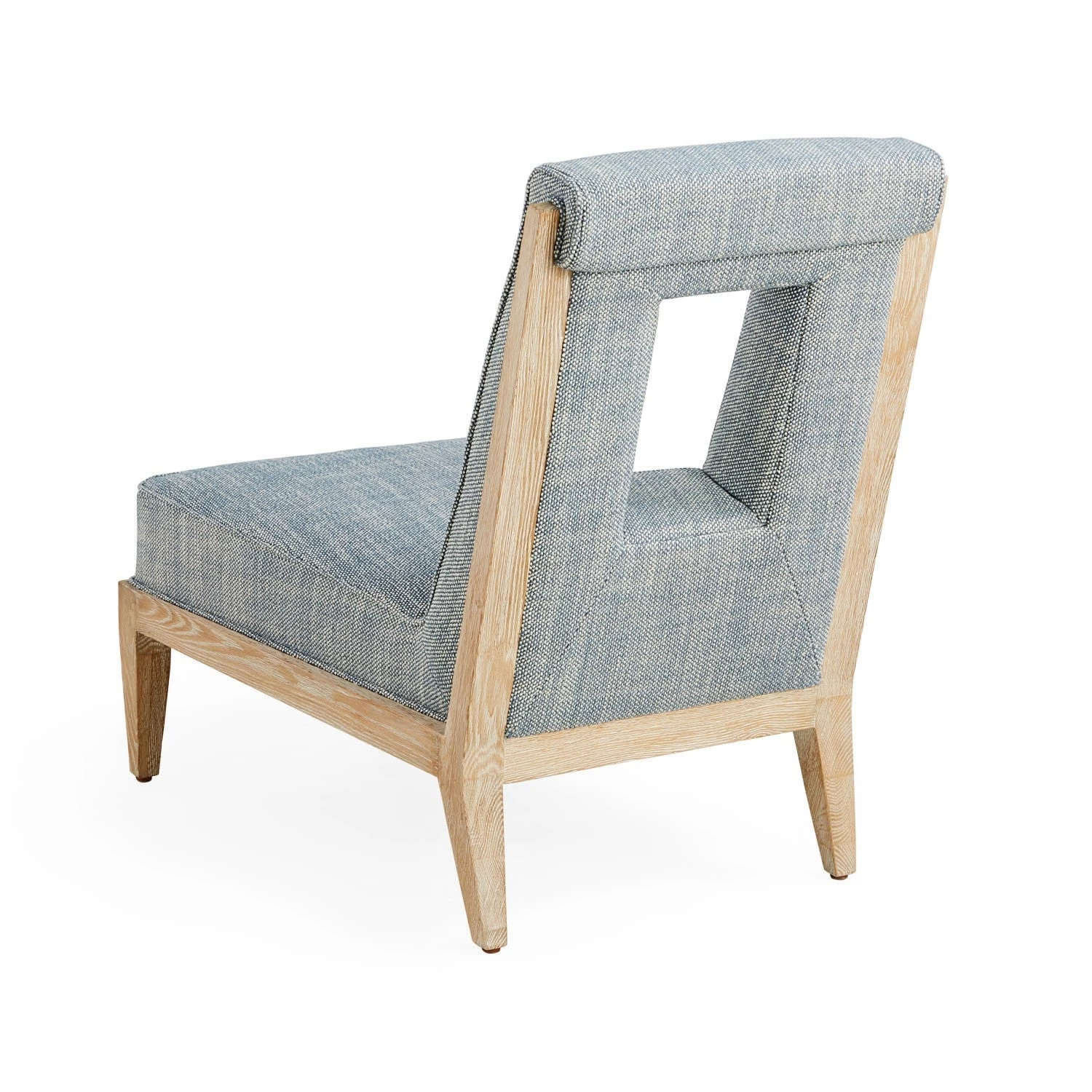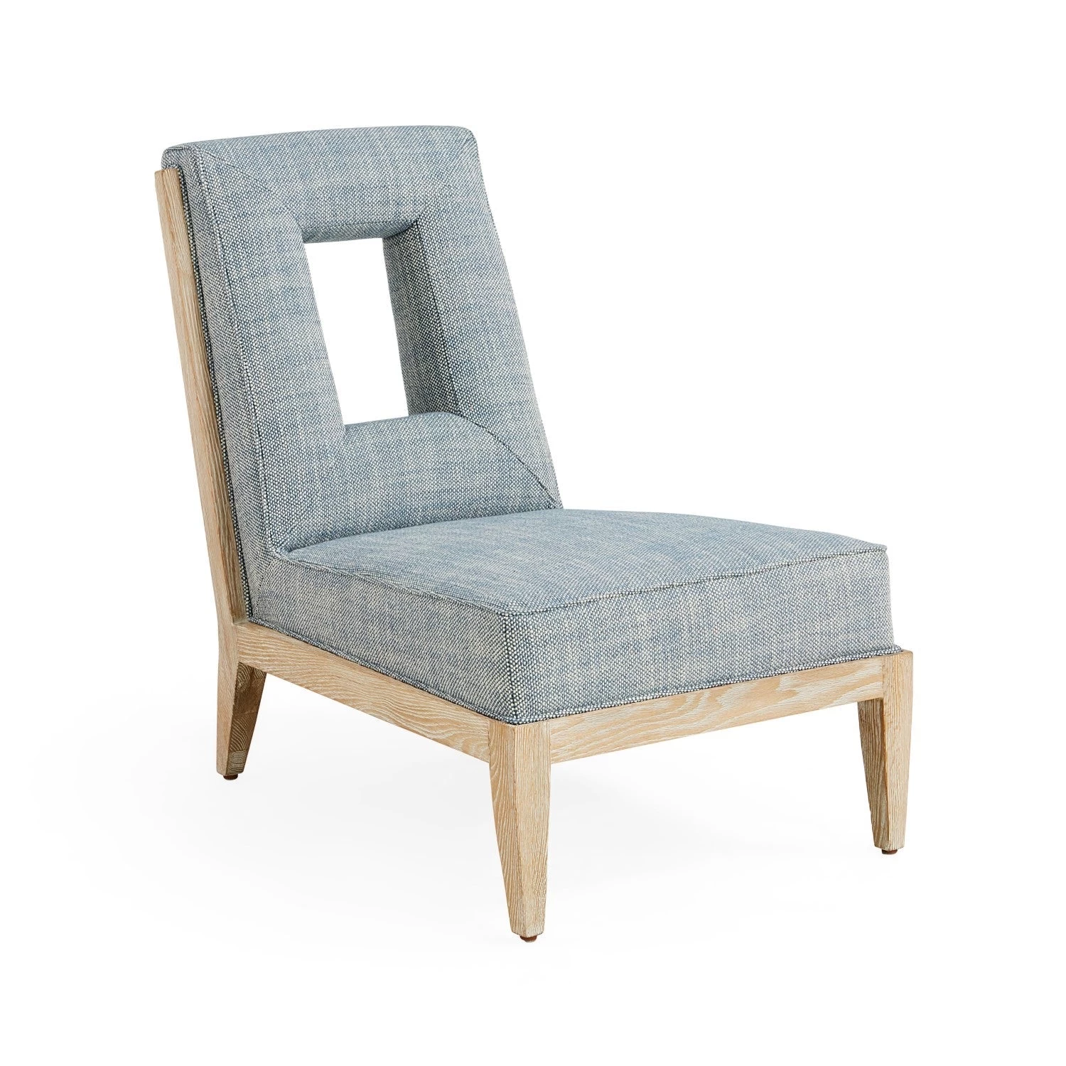Featuring clean, tapered lines and a surprising back cushion cut-out, Cocteau is a knockout of a slipper chair. Its back and deep, perfectly pitched seat are wrapped in a light and refreshing textural french blue and white upholstery, and its ash wood frame that’s been wire-brushed and limed to accentuate the natural wood grain. A standout on its own, but also perfect in pairs.
