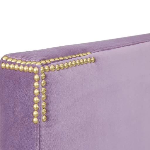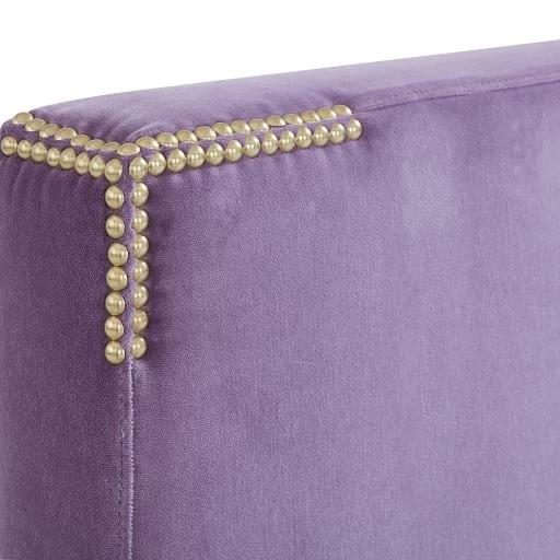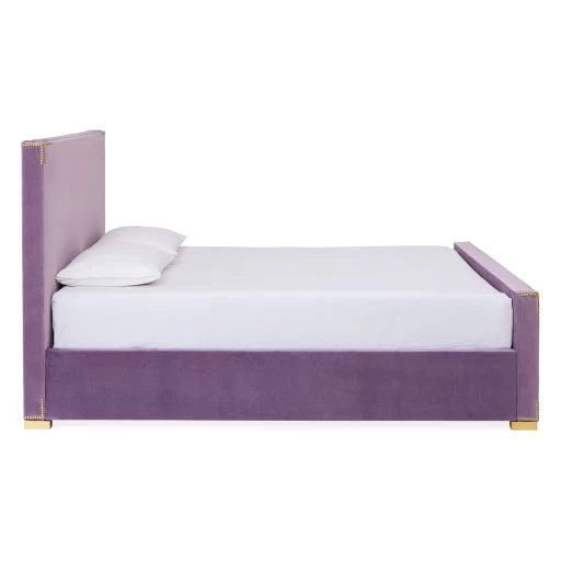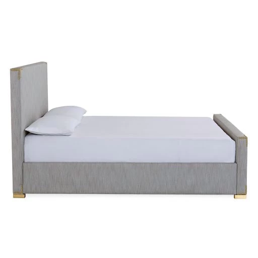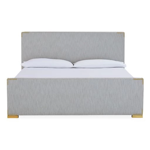 Perfectly minimalist and modern—with a subtle layer of glamour. We’ve arranged nailheads in a pattern to simulate campaign corners, adding subtle ornamentation to a simple upholstered silhouette. The regal frame rests on chunky solid brass or nickel feet, cultivating a stately presence. Finally, a bed husbands and wives will agree on.