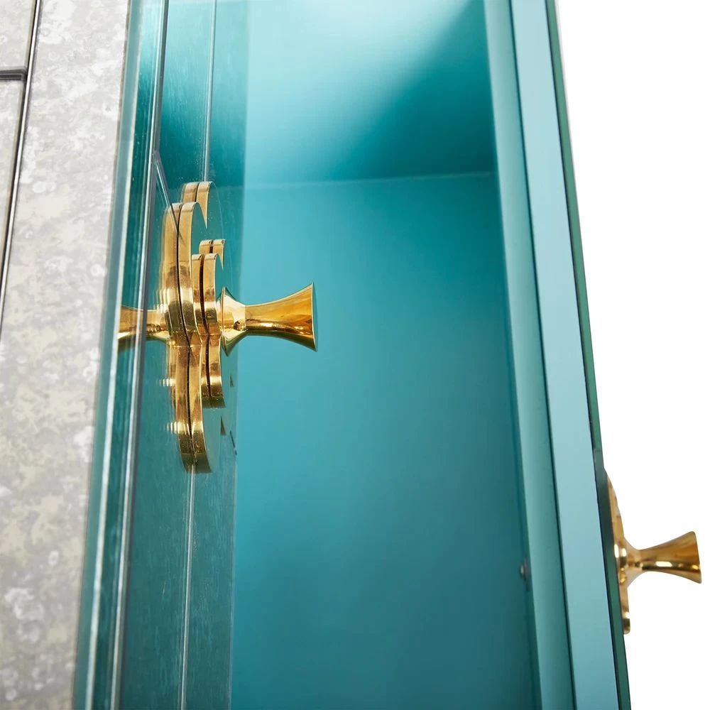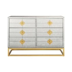 Reflectology. Minimalist forms meet Maximalist glamour. Our Delphine Six-Drawer Dresser features antiqued mirror with a polished brass base and jewel-like quatrefoil escutcheons. Each drawer opens to reveal a bright robin’s egg blue interior.