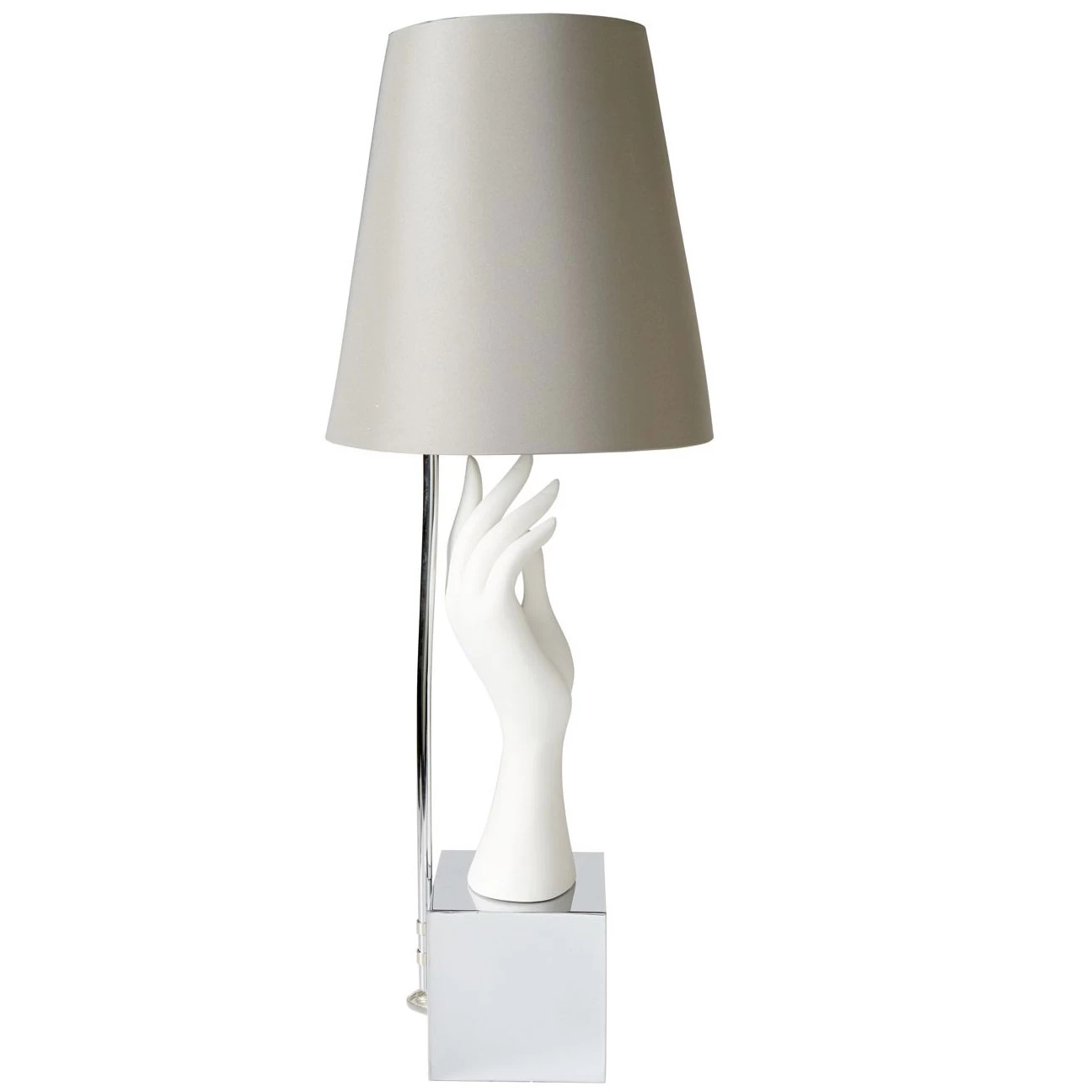 Transform your interior space into a surreal dreamscape with the Eve Table Lamp. The lamp’s base features an unglazed, white porcelain hand reaching upwards from a polished nickel cube base. A grey silk shade tops the piece for an elegant accent. Includes three-way switch.