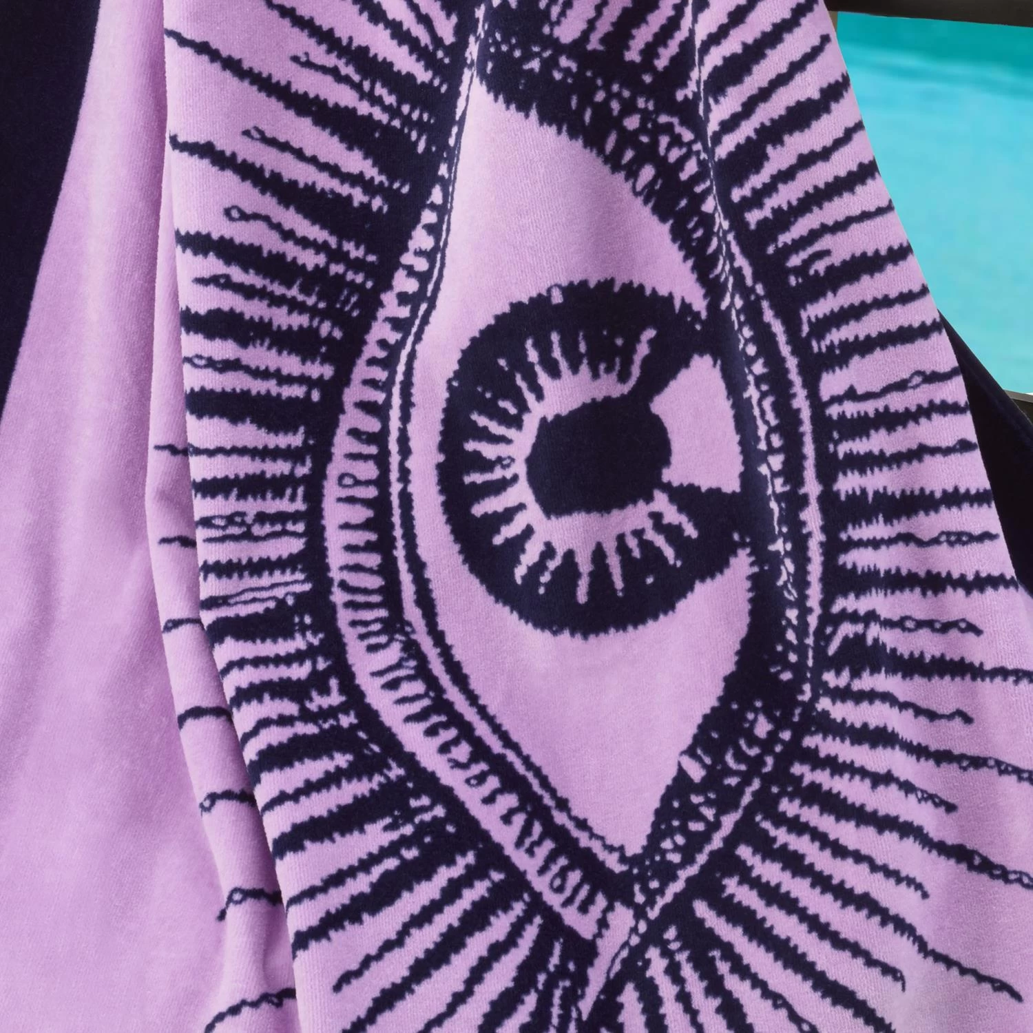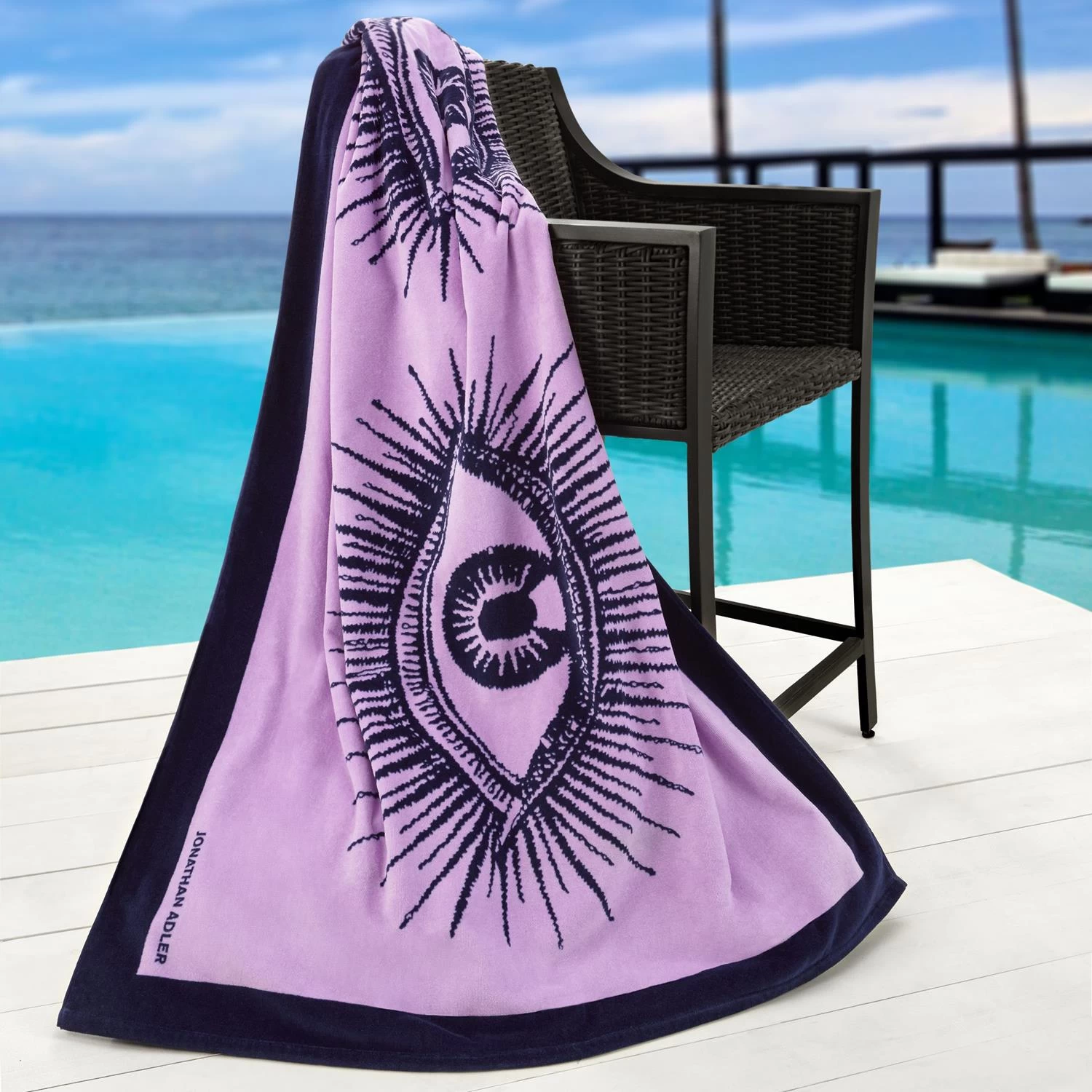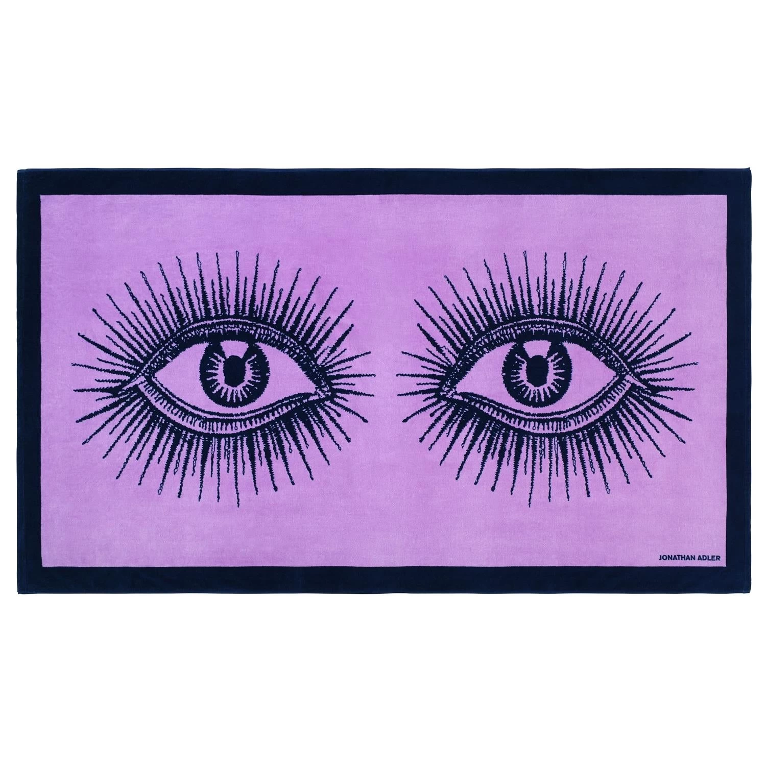 The Jonathan Adler Collection Eyes Beach Towel features a pair eyes outlined in black with long eyelashes on a sheared lilac ground with black border. The terry yarn-dyed reverse is lilac. The towel measures an oversized 40″ x 70″ and weighs in at over 2 pounds.