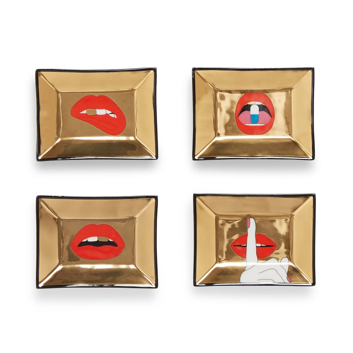 Sexy, seductive and saucy, our petite trays are the little quelque chose you didn’t know you needed, but you kinda do. Add a kiss of tough glam to your bedside, bathroom, or tabletop. Crafted from high-fired porcelain with real gold accents. Indulge yourself or give one as a gutsy gift—our Full Dose set comes packaged in a nifty box.