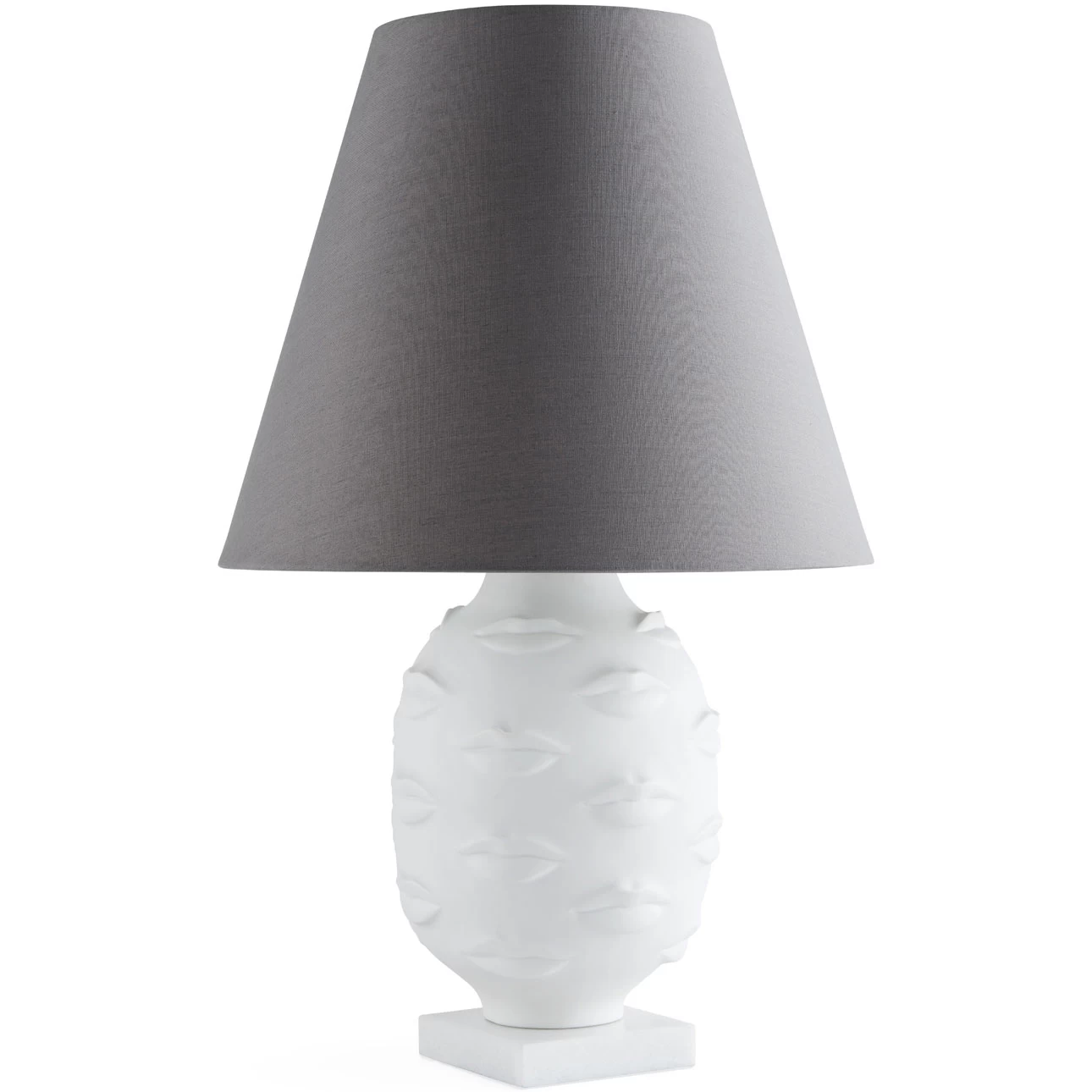 Add a kiss of style to your space with the Gala Table Lamp. The lamp’s base is covered with expressive sets of lips for a striking, surrealist aesthetic. A tapered grey poplin shade grounds the piece with a neutral accent that will complement a variety of interior styles. The lamp is aptly named after Gala Dali, the wife and muse of surrealist artist Salvador Dali. Includes full range dimmer switch.