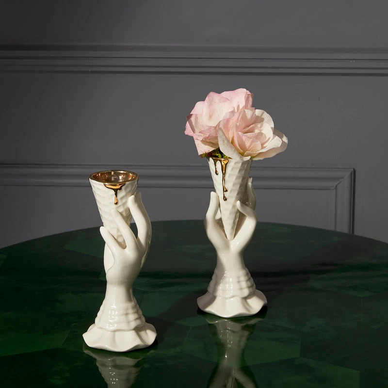 Taking iconic and bumping it up a notch, the Gilded Muse I-Scream Vase brings a golden touch to your interior design scheme. With fluid lines and a flawless Eizabethan ruffled sleeve, this glazed porcelain vase is dripping in real gold accents. Ready to showcase a small bouquet of your favorite beauties or perhaps a singular floral gem, this a-line vase is the perfect size for displaying on a dining room table without taking out the view of your guest across the way. Perfect as a housewarming or hostess gift, this vase brings a playful presence to all environments and homes.