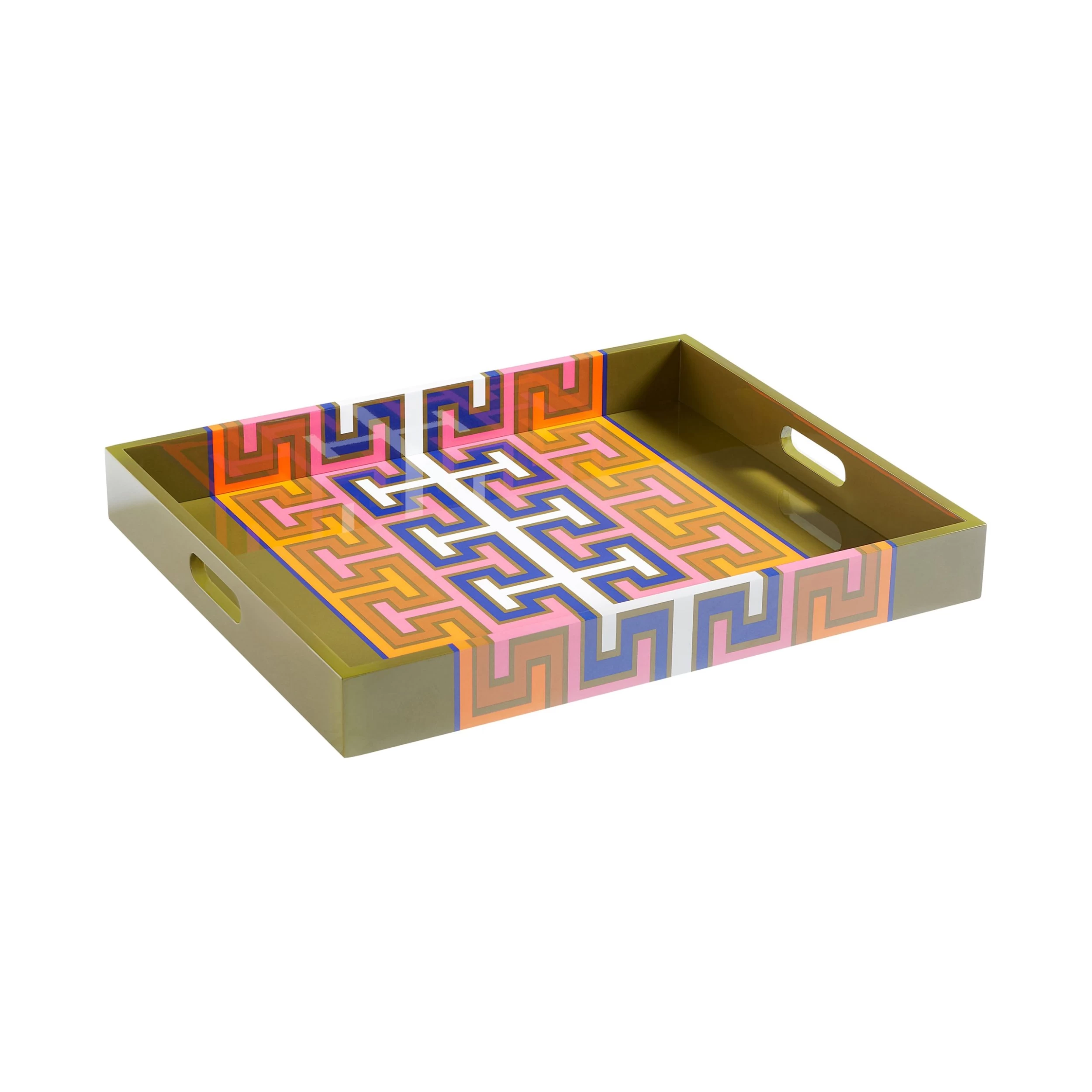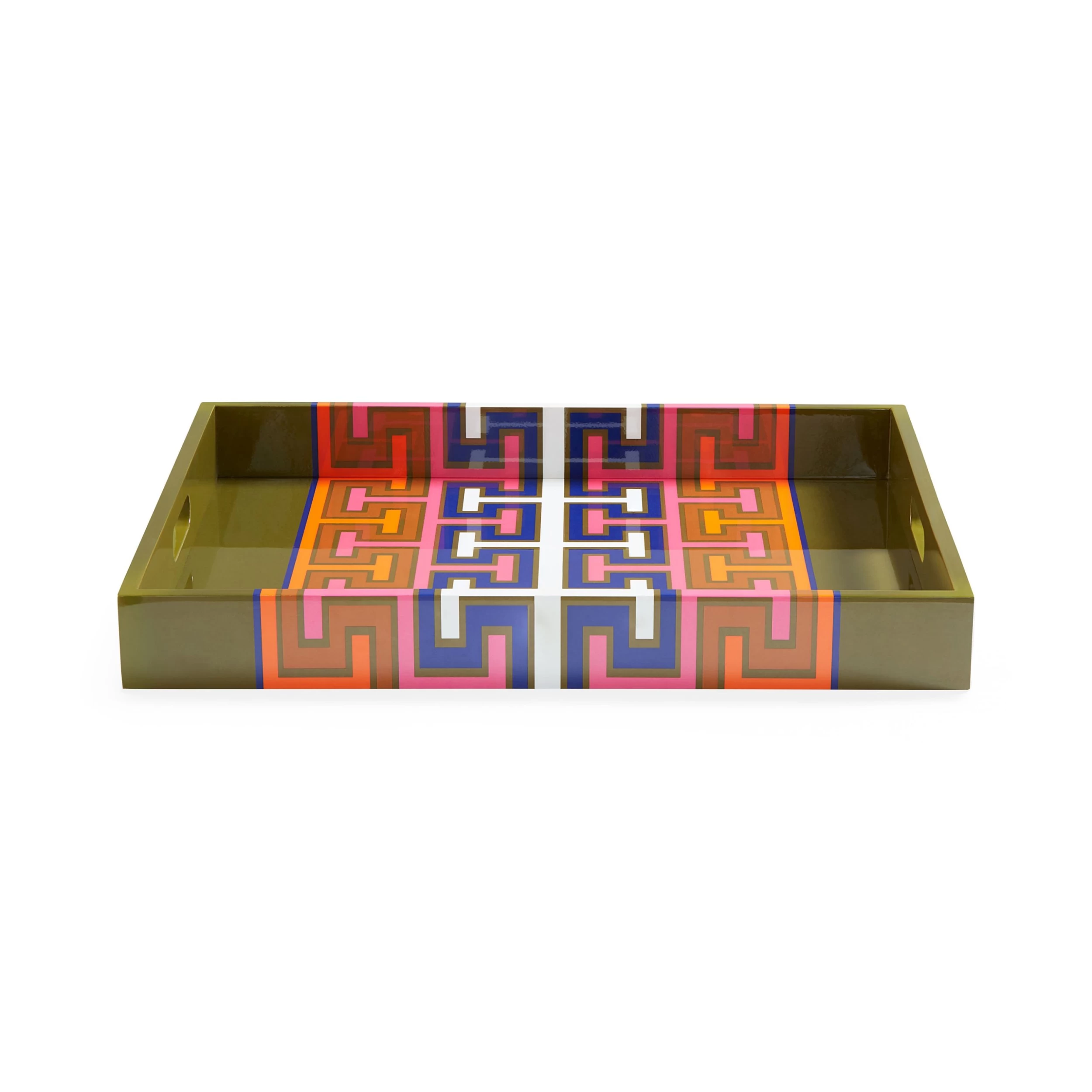 Featuring a bold pattern in vivid cool tones with a white and navy accent down the middle and a hand-finished high-gloss shine. A bold addition to any counter, console, or cocktail table, it corrals your stuff without any fuss.