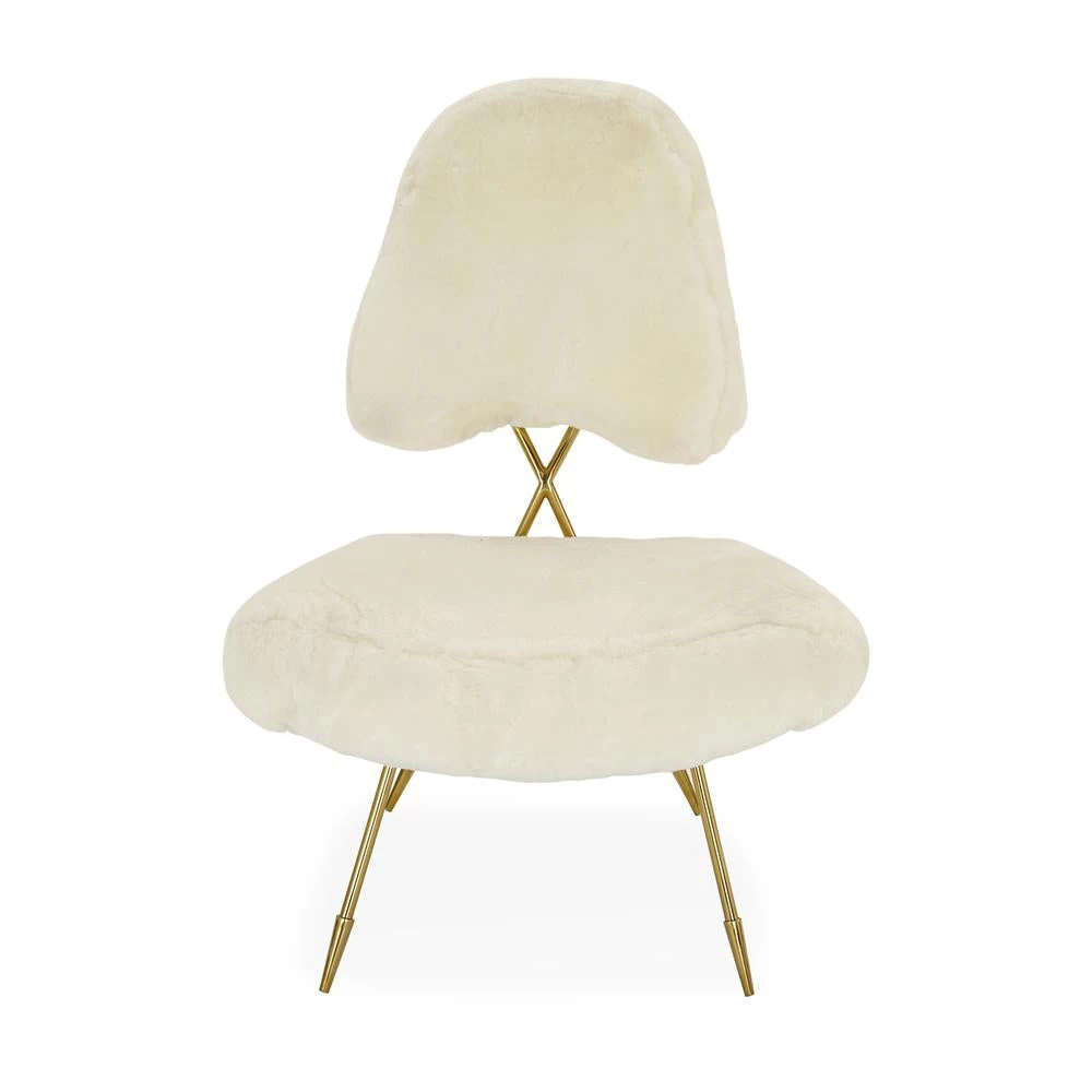 Modern Elegance. A gleaming brass frame with an intriguing crisscross back and our signature sabots cradles a softly curved seat and sculptural back. But don’t be fooled by the graceful frame—the Maxime Lounge Chair is very comfy. Available in sumptuous shearling upholstery. Fab in a glamorous boudoir or living room.