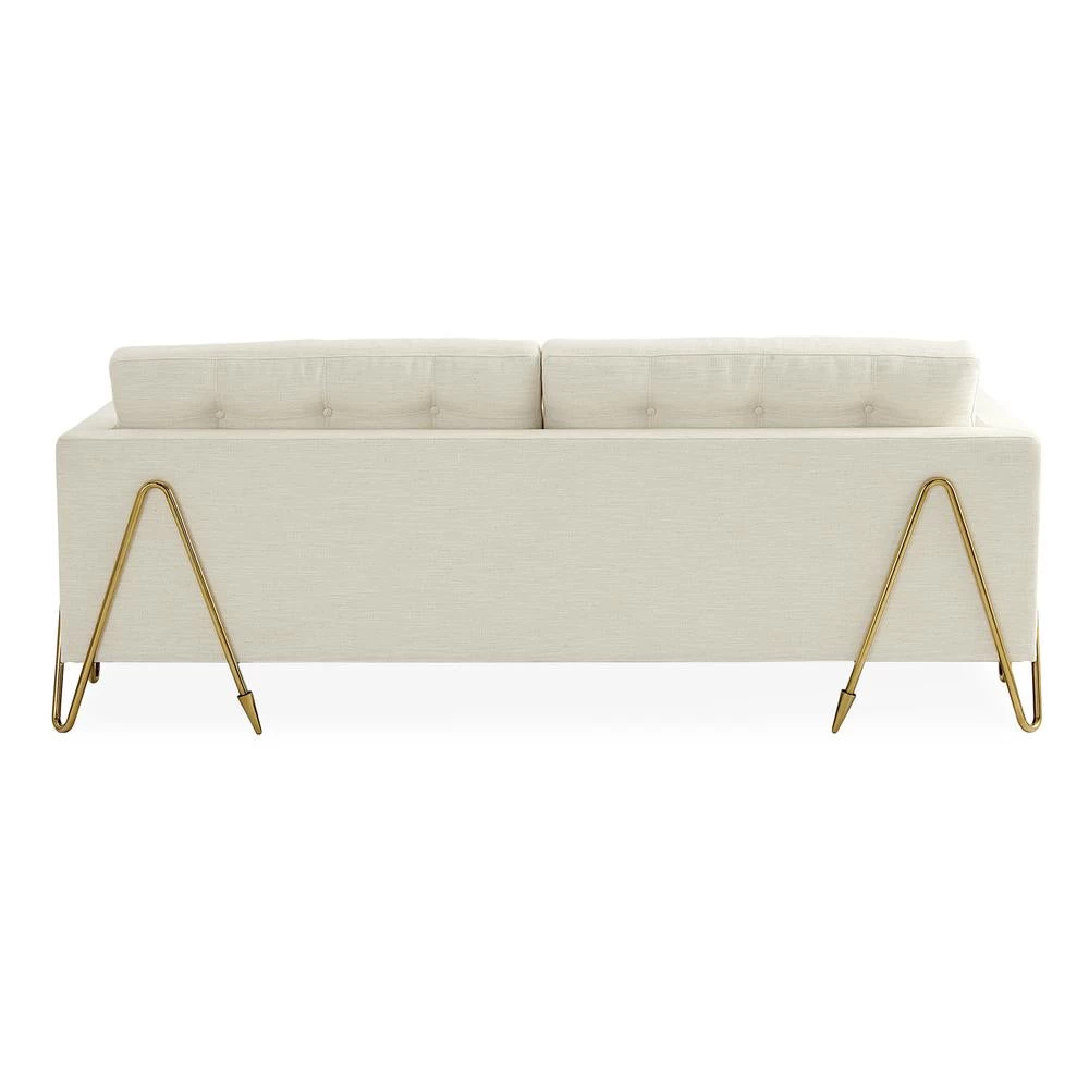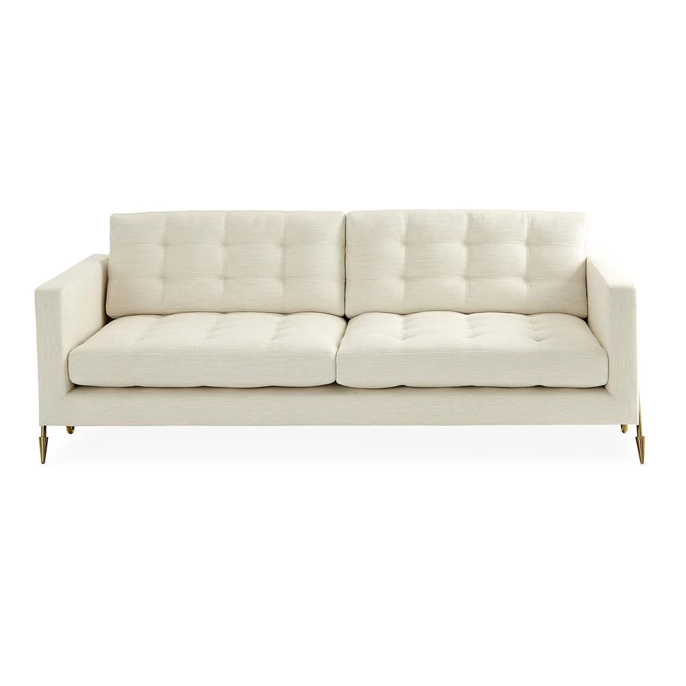 A hard-working sofa with an haute couture finish. Our Maxime Sofa features a mid-century-inspired silhouette cradled by an undulating brass frame featuring our signature arrow sabots. Upholstered in Lucerne Oyster bouclé and marked by its reversible topstitched cushions—buttons on one side and pull tufts on the reverse to let you tailor the tailoring.