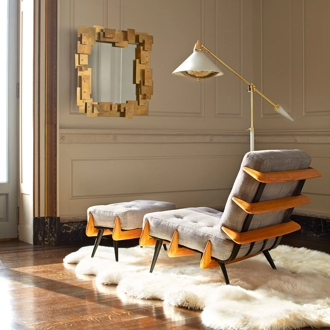 The Maxime Task Floor Lamp takes inspiration from mid-century modern design with its White lacquered cone base and matching shade, paired with a perforated Brass diffuser to cast a soft golden glow of light. UL and CUL listed.