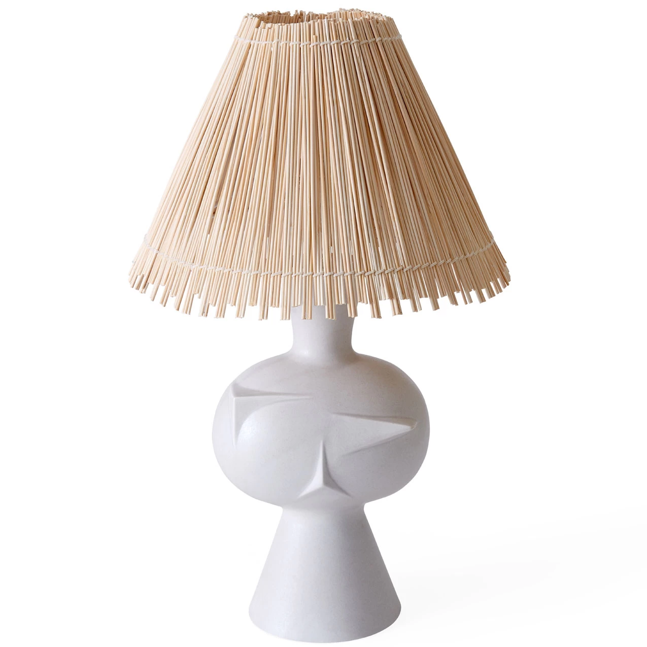 The Metropolis Table Lamp pairs a warm, rattan shade with a boldly shaped stoneware base. The base features a Cubist-inspired face covered in a stone grey glaze that gives the lamp a playful, sculptural appearance. Includes full range dimmer switch.