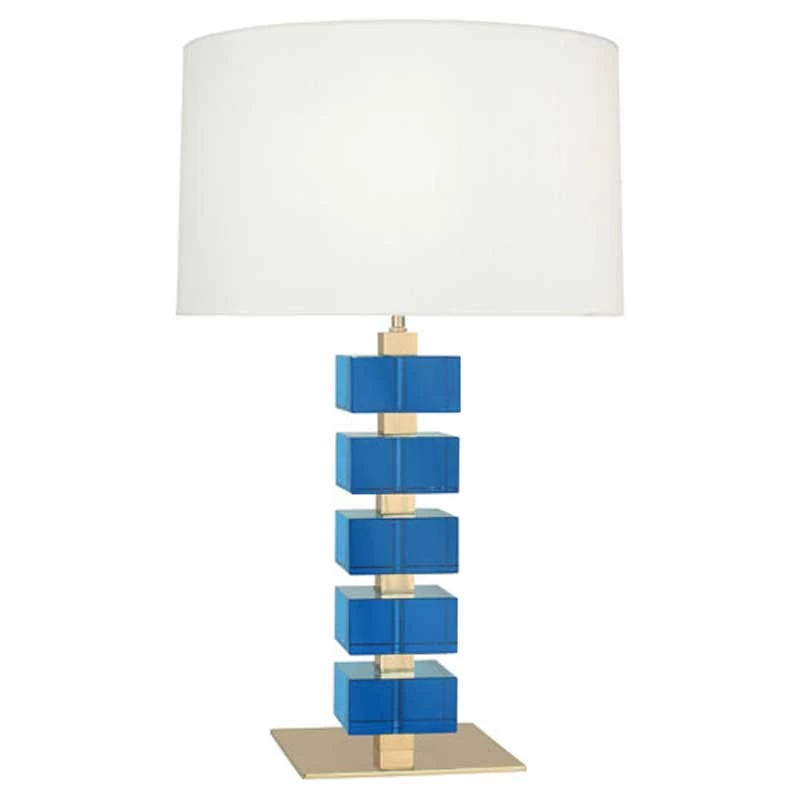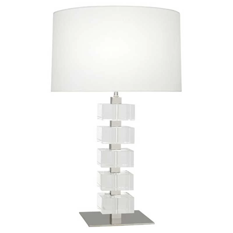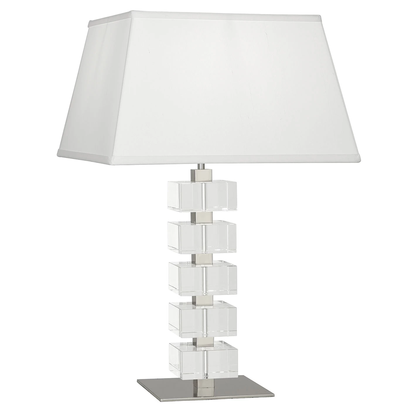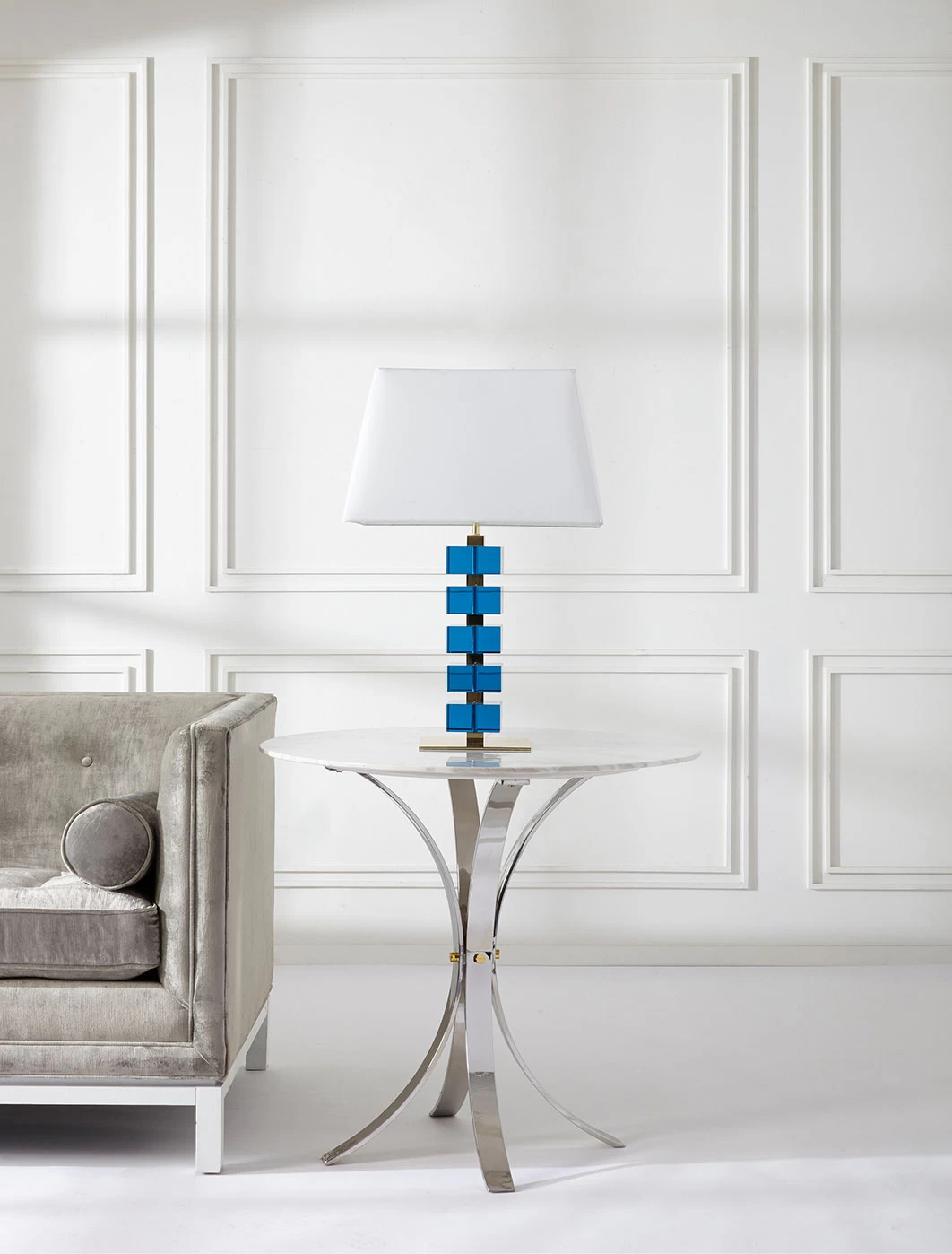 The Monaco Table Lamp offers a chic design that will compliment any space with its bold design featuring blocks of Crystal set into a metal base and topped with a White silk shade. Available with a rectangular or round shade in Turquoise Crystal with a Natural Brass finish, in Clear Crystal with a Polished Nickel finish, or Smoke Crystal with a Natural Brass finish. UL and CUL listed. NOTE No Smoke Crystal with Natural Brass.