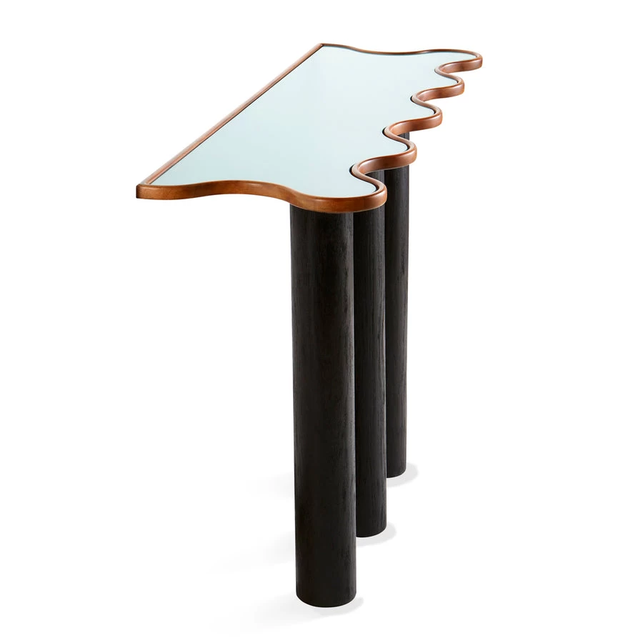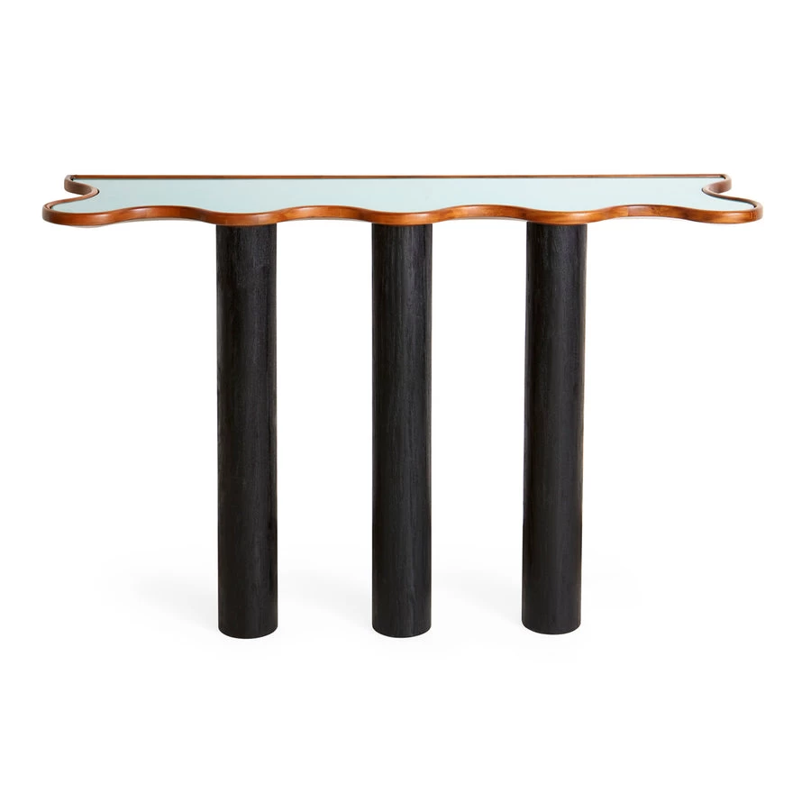 Our Monterey Ripple Console features a solid mahogany tabletop treated to our signature ripple edge and inset with tempered glass. On three chunky ebonized oak legs with a wire-brushed finish. Wall mountable with a slim profile, it’s a natural in a small entry and other petite spaces. Top it with a statement mirror or piece of art to create a big moment.