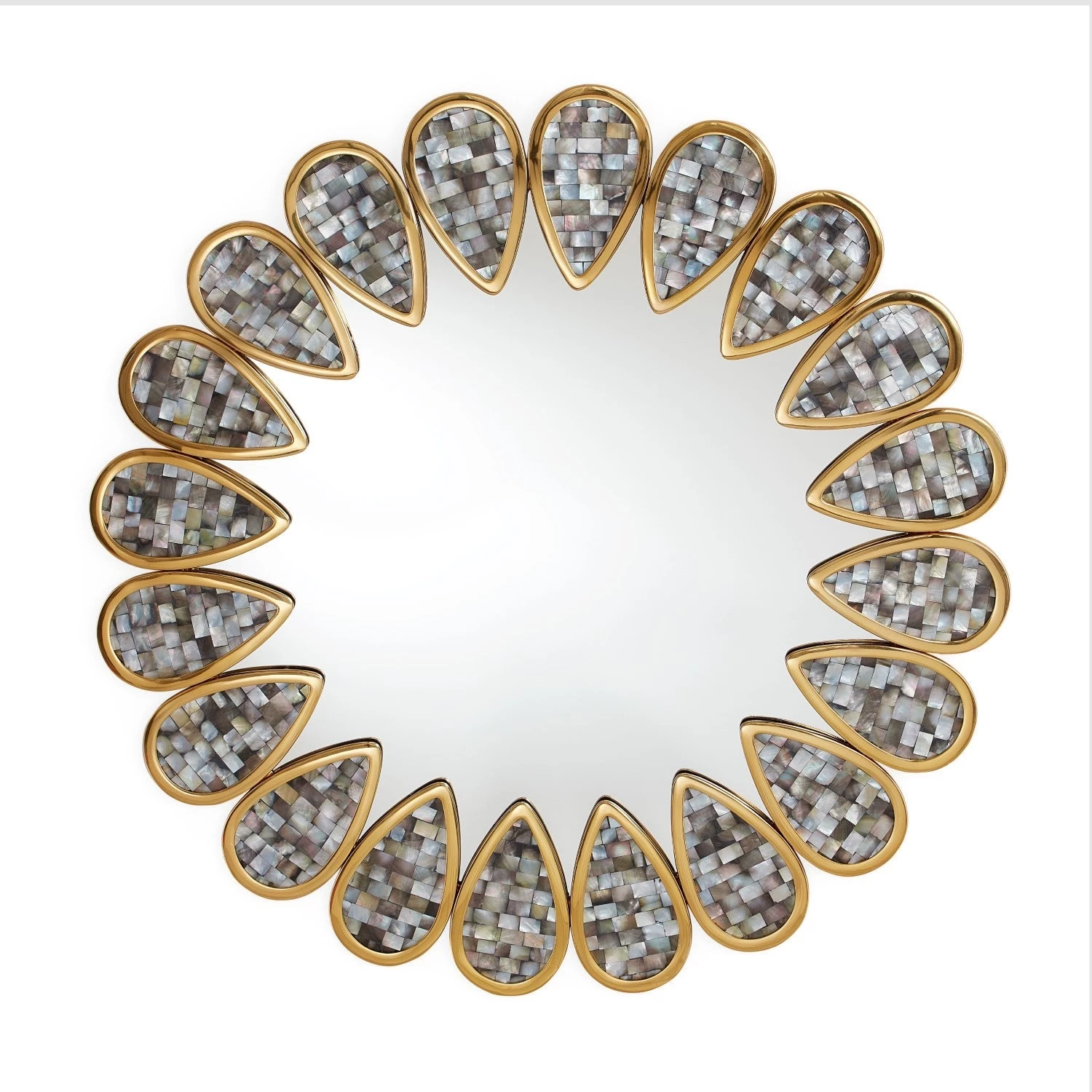 Sought after for its iridescent surface, mother of pearl offers a unique collage of colors often used in fine jewelry. Cut in thin pieces and set in polished brass petals, the mother of pearl in our Petal Mirror radiates a shimmering, grey-toned twinkle. It’s super chic jewelry for your home.