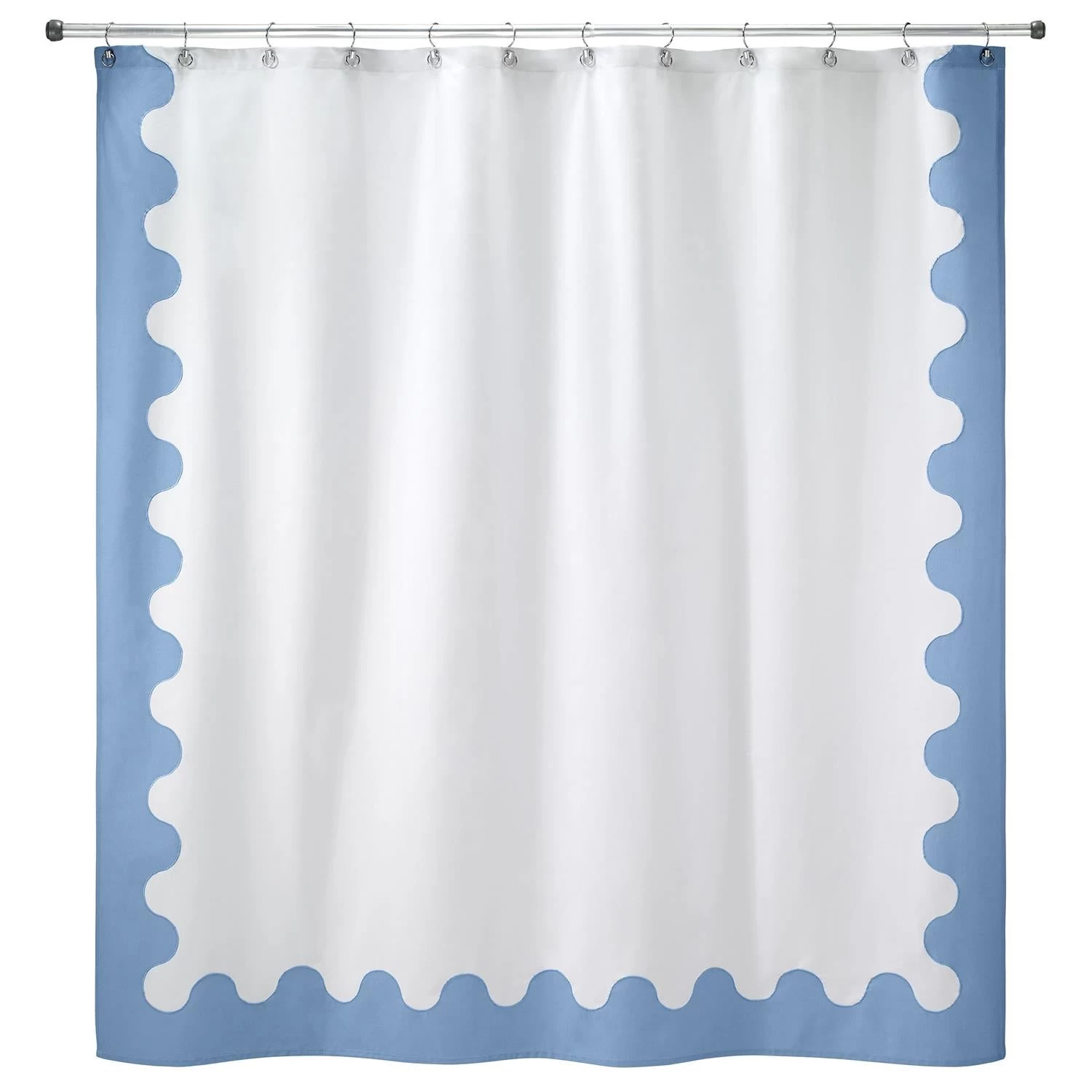 The Jonathan Adler Collection Ripple Shower Curtain features an update on a classic scallop design with a cornflower blue scallop bordering a white ground with embroidery separating the 2 colors. 100% cotton duck cloth for soft feel and great look. 72″ x 72″.