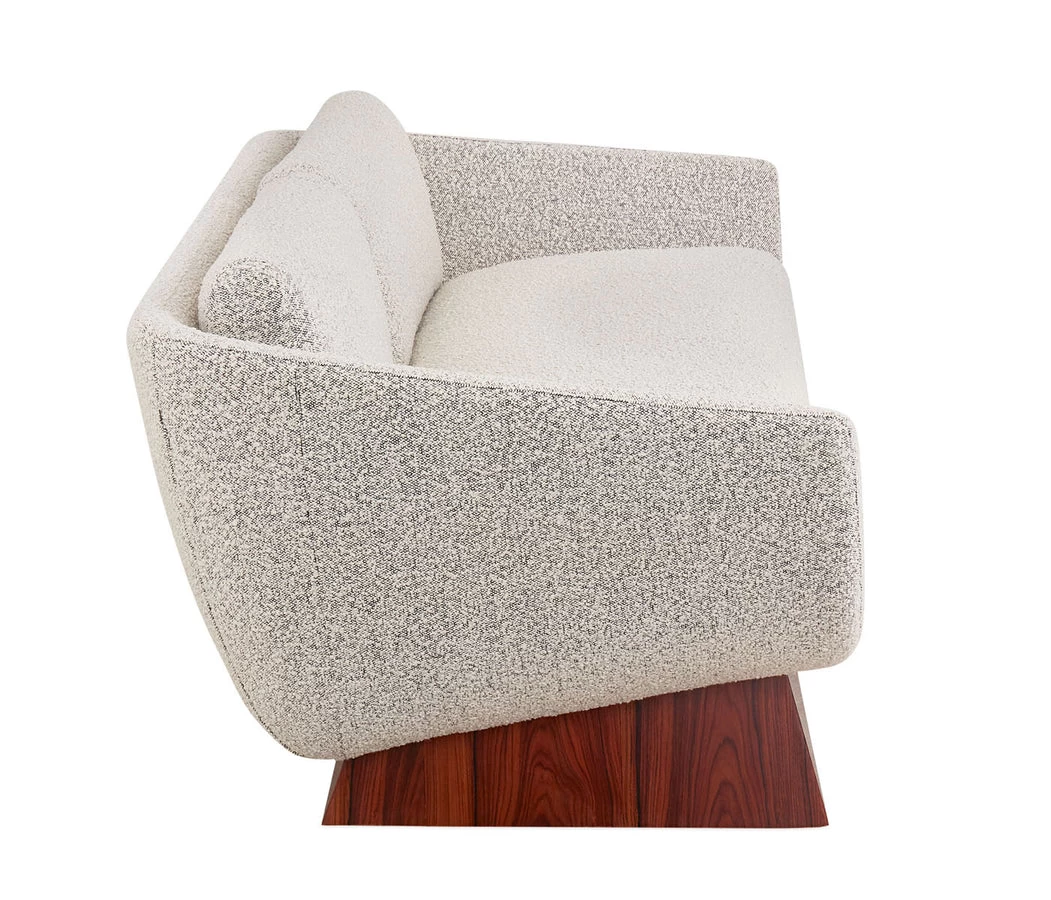 Our classically handsome Rosewood Beaumont Sofa features a trapezoid shaped base crafted from naturally rich, warm rosewood. Upholstered with a speckled Olympus salt and pepper bouclé, this super comfy sofa imparts the same balance, geometry, and cocoon-y comfort of its brass-based counterparts, but with an extra hygge hug. Deep, feather-wrapped cushions take an already comfy seat to the next level. You’ll never want to get up.