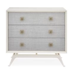 Revolutionary Raffia. Our exotic Siam collection gets a fresh new feel. Featuring a solid mahogany case coated in ivory lacquer and drawers faced with layers of natural raffia stained in an icy sky blue lacquer. Brass accents and Greek key hardware crank it up to 11.