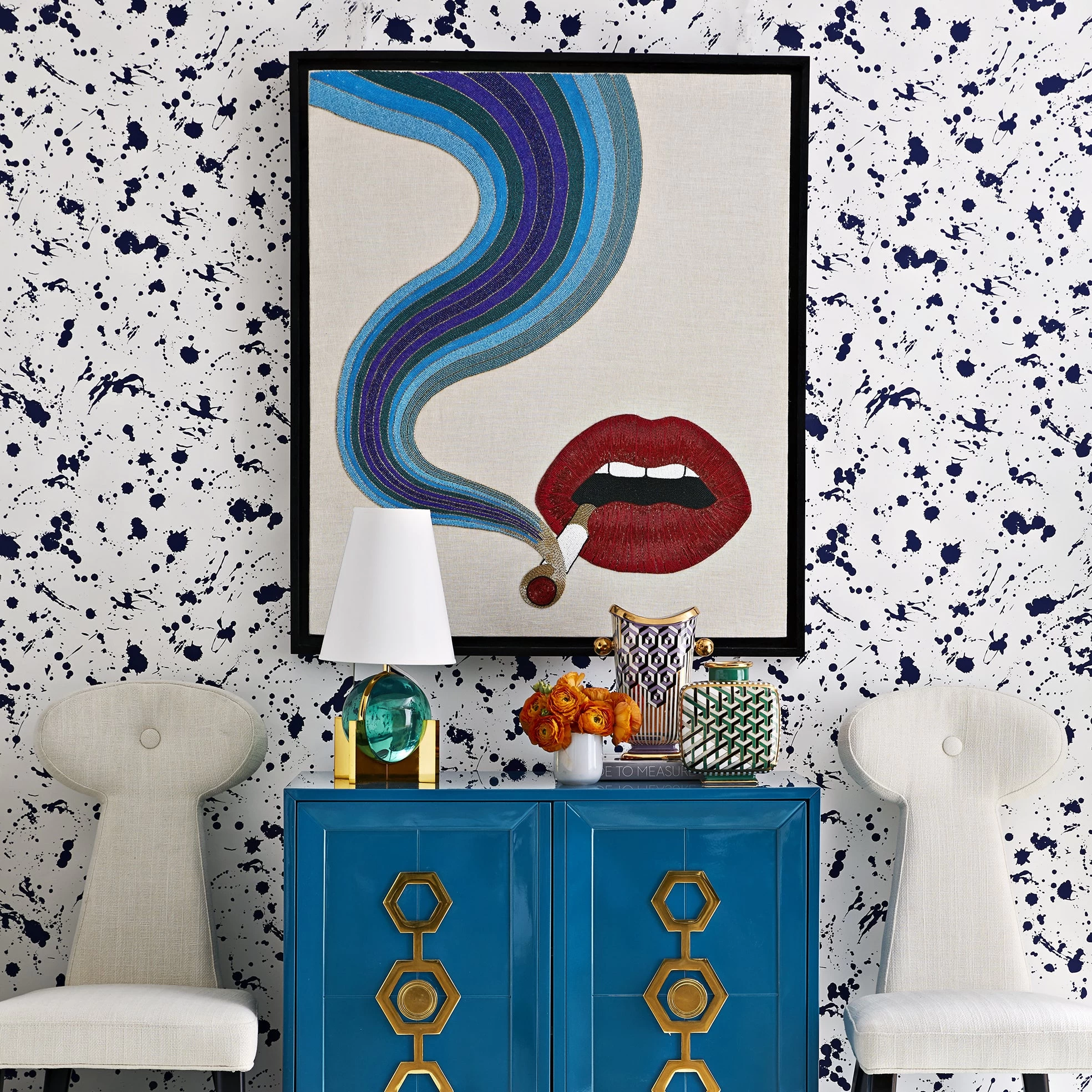 Featuring the signature lip pattern and swirling detailing, the Smoulder Beaded Wall Art from Jonathan Adler brings a textured and sultry statement to your interior design scheme. Crafted in collaboration with an artisan workshop in India, this piece features hand-beaded detailing on a stretched linen background taking upwards of 100 hours to complete. An excellent choice for an entryway vignette or as a statement piece in your bedroom or office, this wall art brings a detailed and sexy vibe to any space you call home.