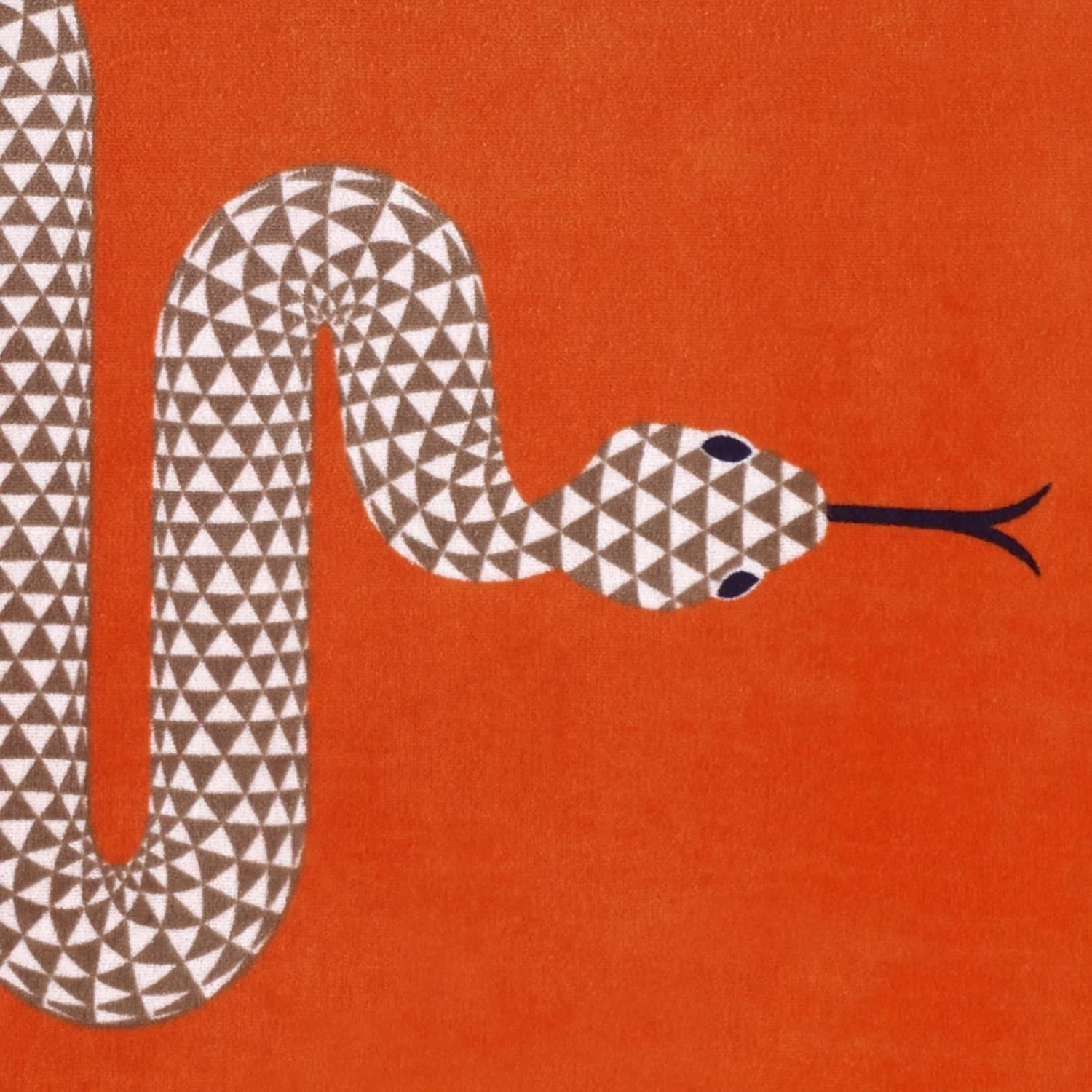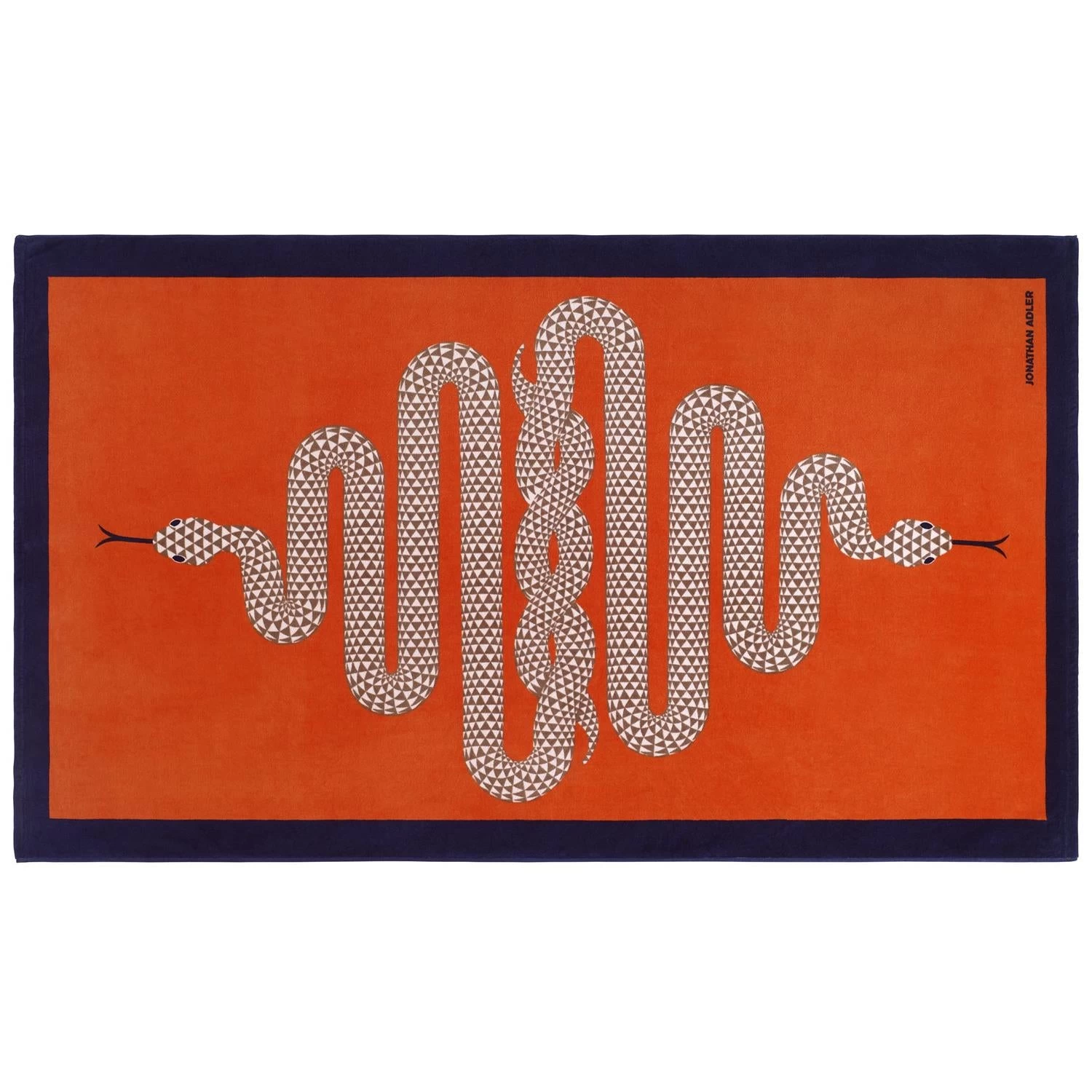 The Jonathan Adler Collection Snake Beach Towel features 2 gold snakes facing either end on a sheared orange ground with gold border. The terry yarn-dyed reverse is orange. The towel measures an oversized 40″ x 70″ and weighs in at over 2 pounds.