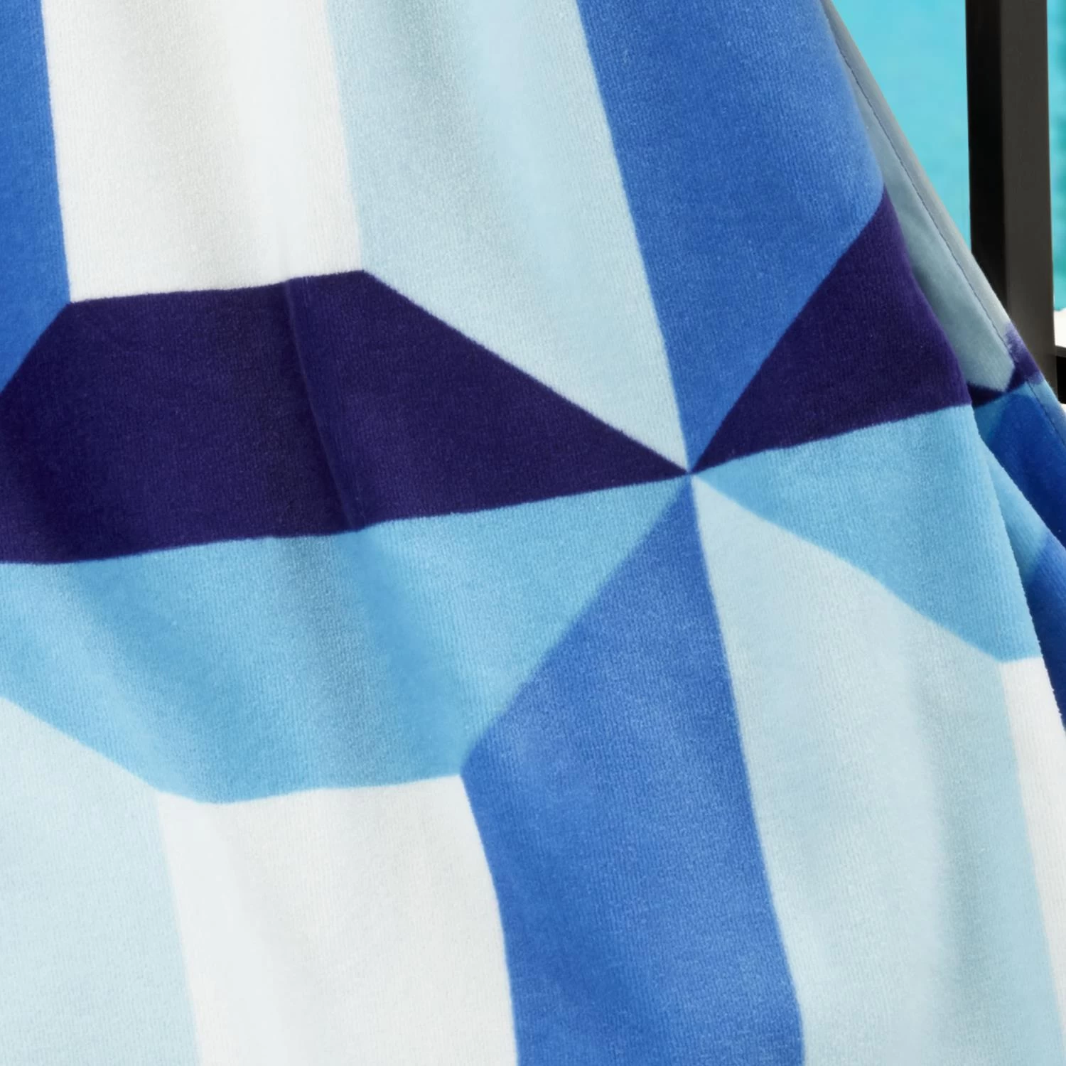 The Jonathan Adler Collection Sorrento Beach Towel features a contemporary geometric design in multiple shades of blue and white on a sheared ground. The terry yarn-dyed reverse is light blue. The towel measures an oversized 40″ x 70″ and weighs in at over 2 pounds.