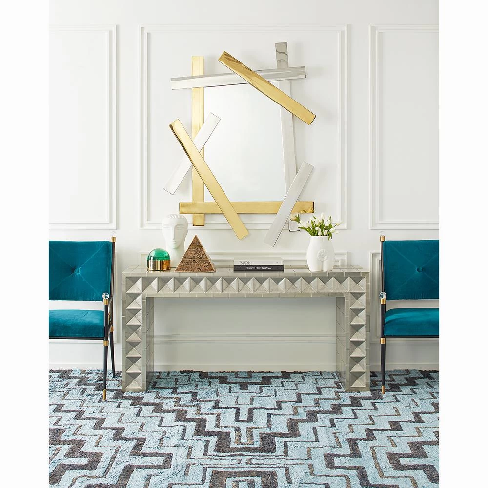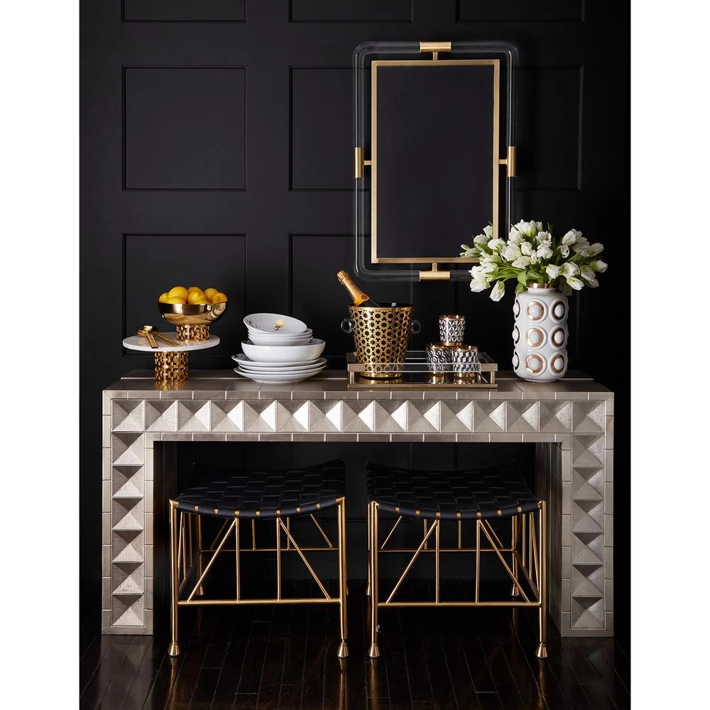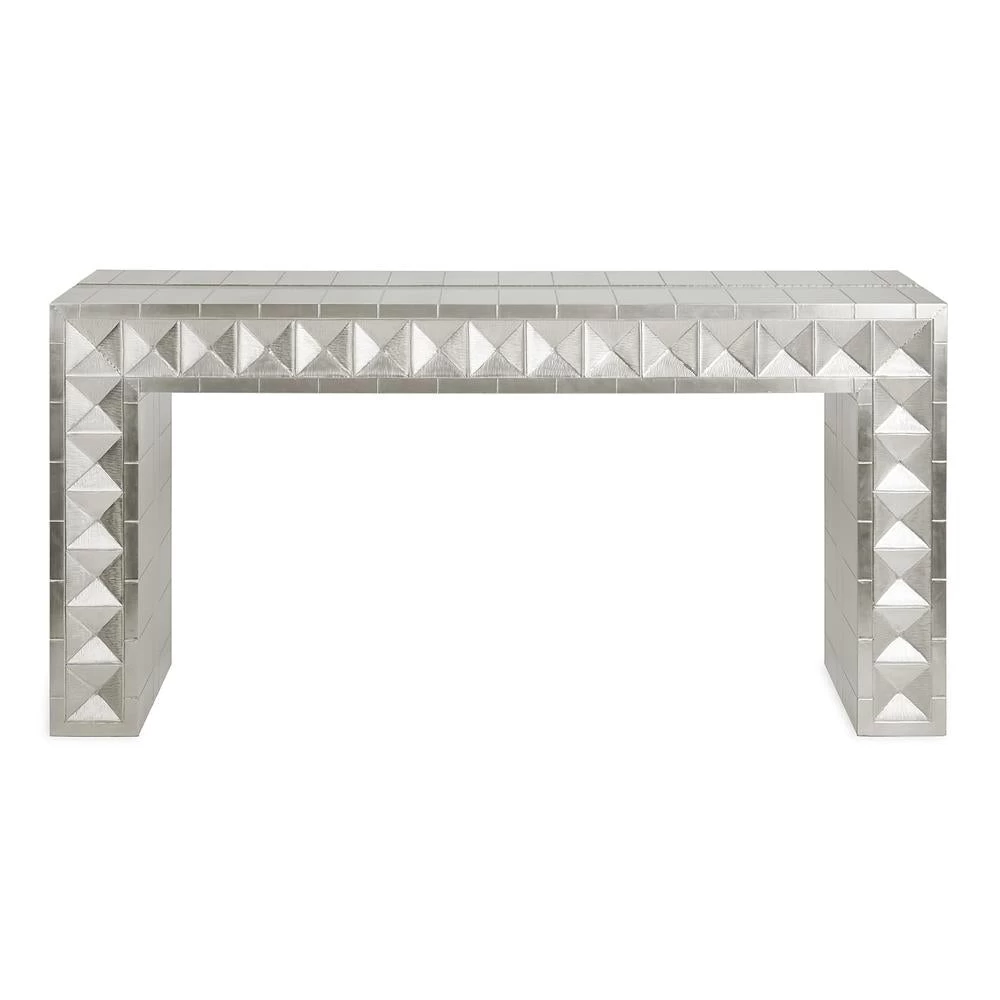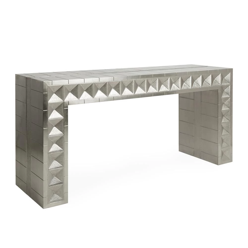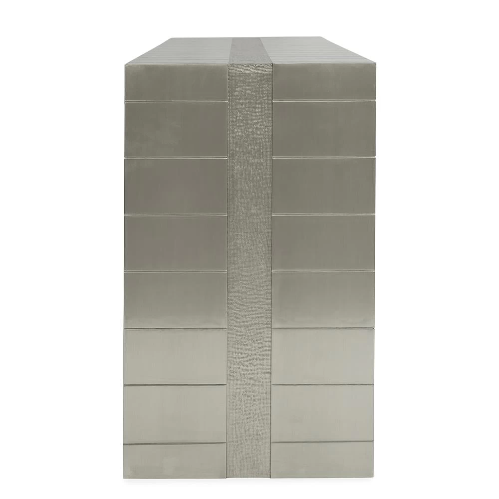 Global Glamour. Crafted from nickel-plated metal with hand-stamped patterns applied to a minimalist, modernist form. The surface is reminiscent of silver leaf—it emits that same lustrous glow—but is wonderfully durable.