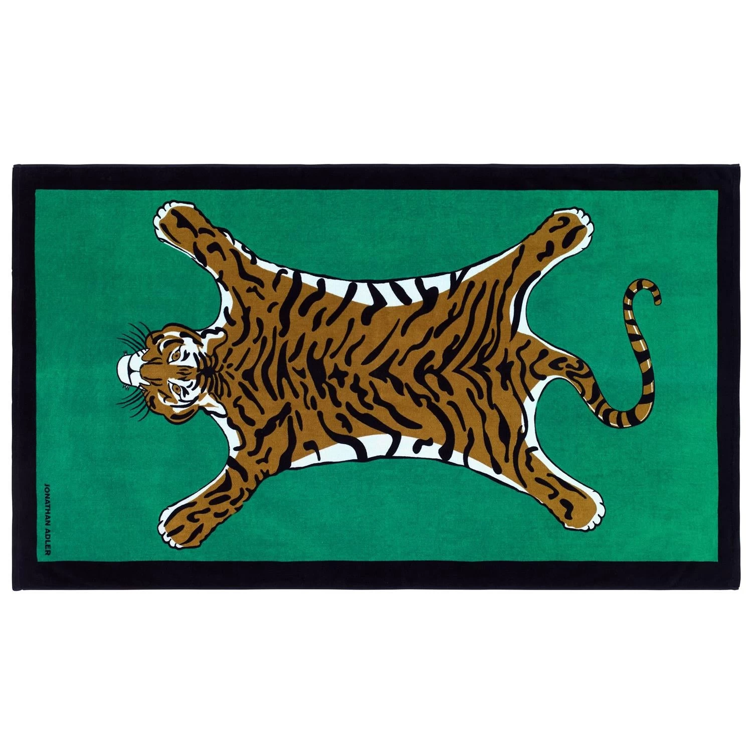 The Jonathan Adler Collection Tiger Beach Towel features a tiger skin design on a sheared medium green ground with black border. The terry yarn-dyed reverse is medium green. The towel measures an oversized 40″ x 70″ and weighs in at over 2 pounds.