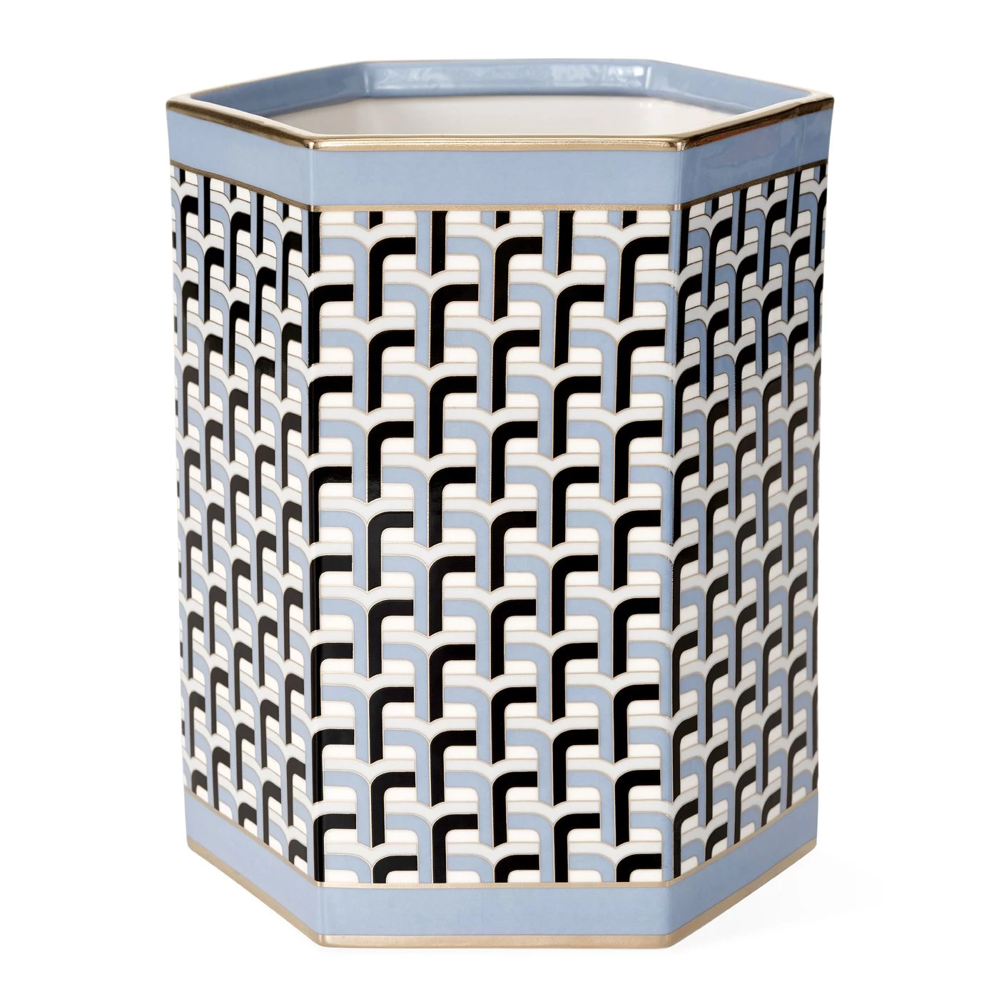 The Jonathan Adler Collection Versailles Wastebasket is beautifully decorated with a full wrap decal in shades of blue, black and white with a fine gold outline. Real gold trim accents the top and bottom, for a sophisticated, elegant look. Crafted of fine porcelain.