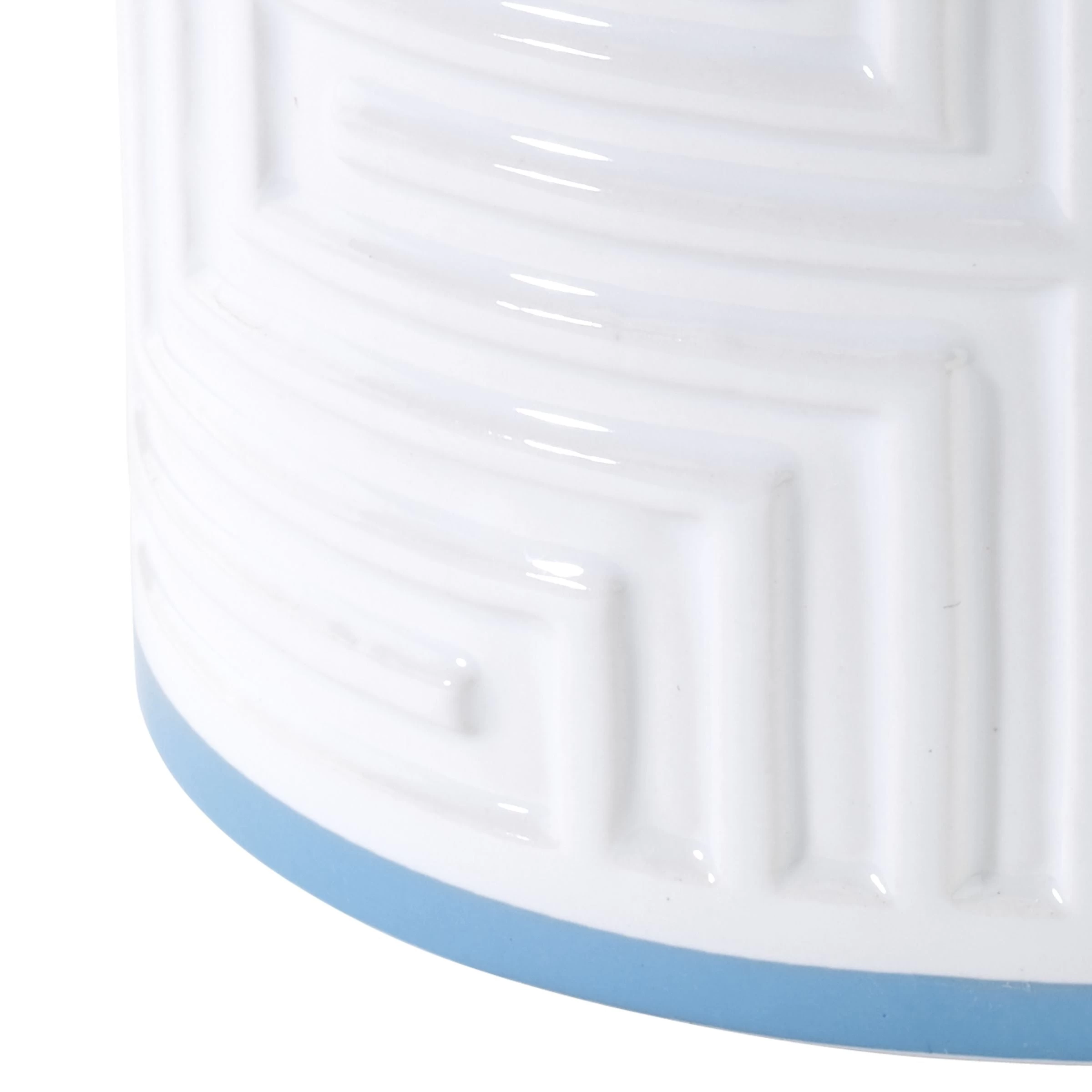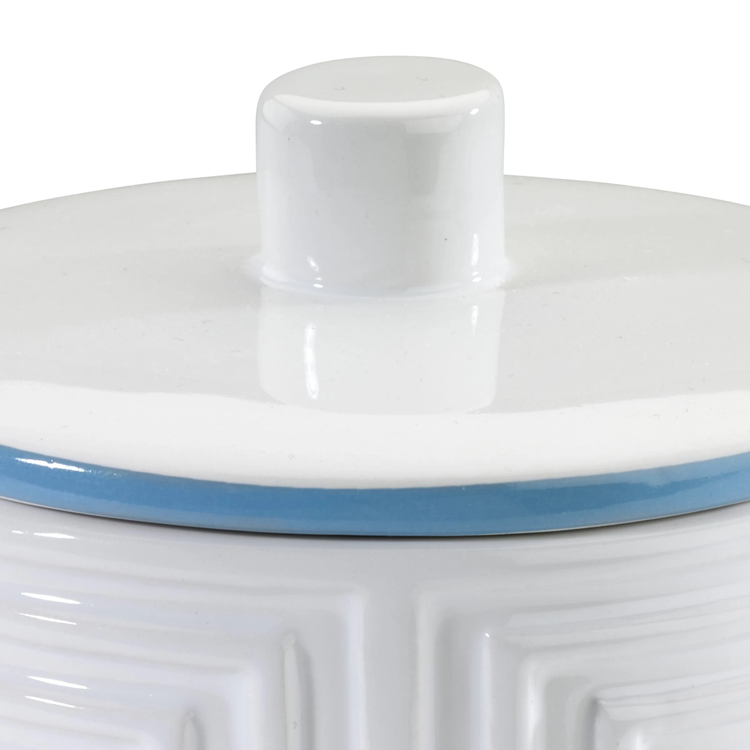 The Now House by Jonathan Adler Mercer Covered Jar is decorated with a debossed maze pattern highlighted with an aqua stripe at the top and bottom. Ceramic, imported.